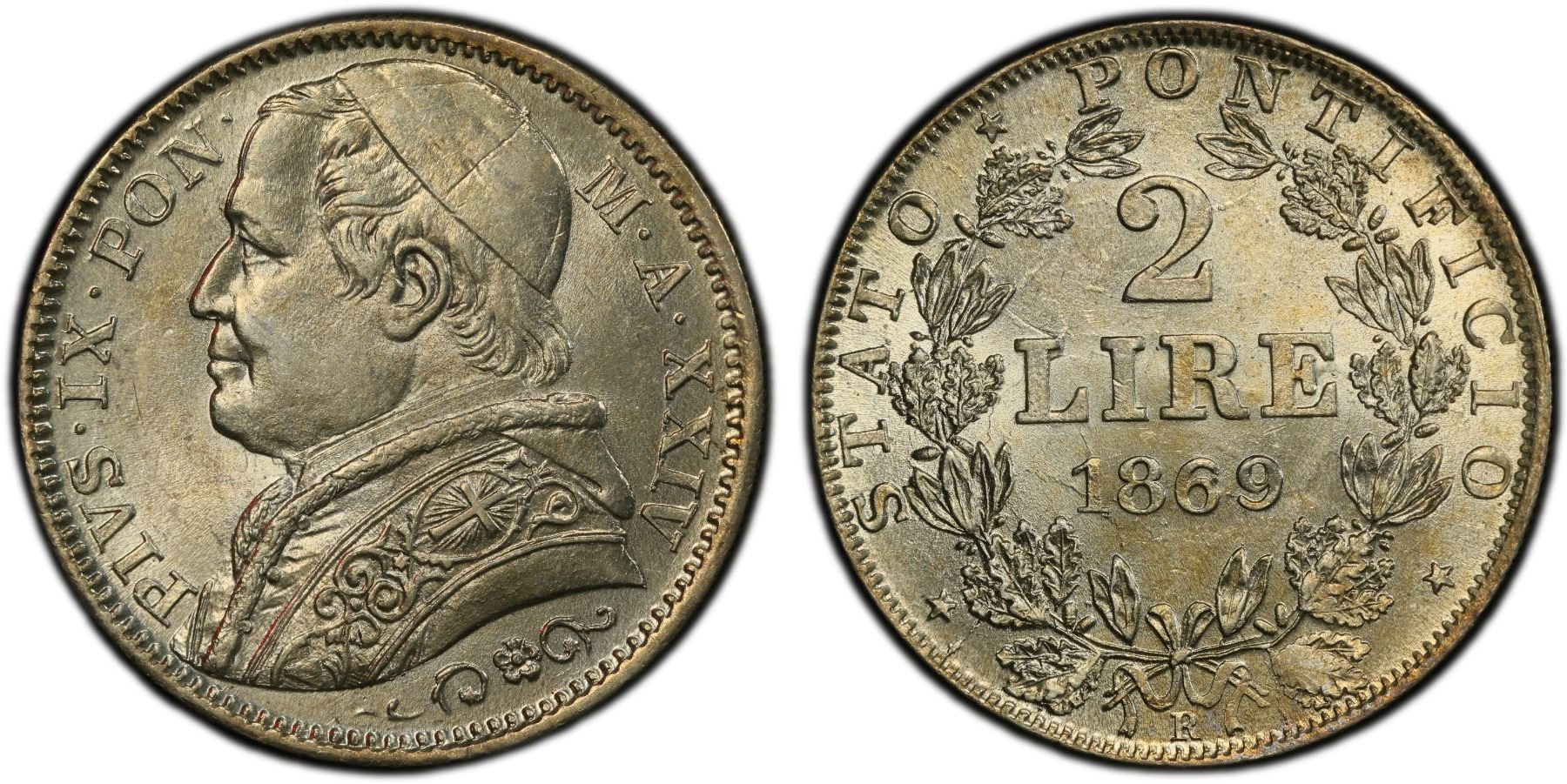 PAPAL STATES: Pius IX, 1846-1878, AR 2 lira, 1869-R year XXIV, KM-1379.3, PON MAX, large bust variety, a wonderful lustrous mint state example! PCGS graded MS64. The sole finest graded example at PCGS (Top Pop).