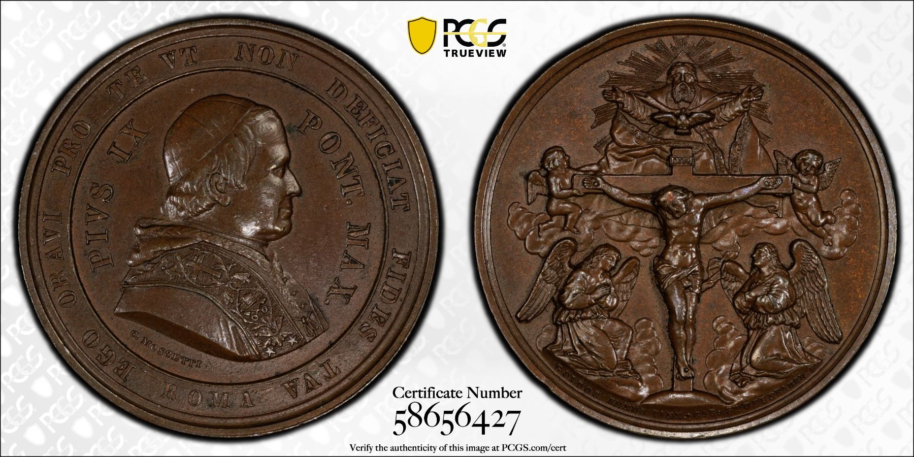 PAPAL STATES: Pius IX, 1846-1878, AR medal (16.41g), ND, 37mm bronze medal by C. Moscetti, The Holy Trinity by artist Guido Reni; PIVS IX PONT. MAX. around Papal bust right, EGO ORAVI PRO TE VT NON DEFICIAT FIDES TVA ROMA in outer legend, signed C MOSCETTI below bust // Jesus crucified supported by two cherubs and topped by the Holy Spirit with two angels praying at feet and GUIDUS RENUS PINXIT – CAR STUBENRAUCH F below, a wonderful mint state example! PCGS graded MS64. The Holy Trinity painting, depicting God the Father, the crucified Christ, and the Holy Spirit as a dove surrounded by angels, was painted by the renowned Italian artist Guido Reni and was completed in July 1626, and commissioned by Cardinal Lodovico Ludovisi in 1624, for the Santissima Trinità dei Pellegrini church in Rome. It was allegedly painted in only 27 days.
