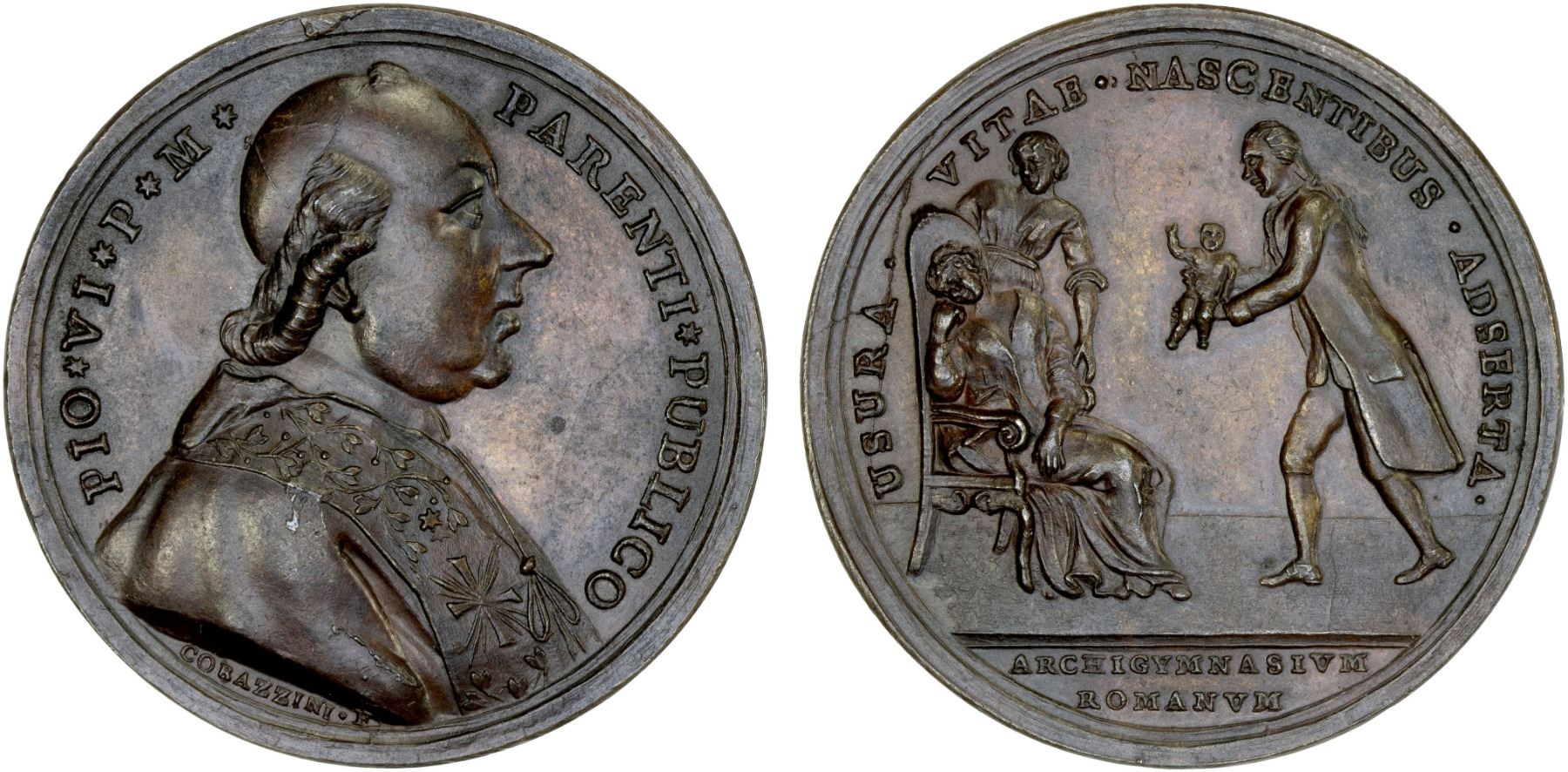 PAPAL STATES: Pius VI, 1775-1799, AE medal (15.61g), 37mm bronze medal by Corazzini, bust of Pius VI right, PIO VI P M PARENTI PUBLICO // doctor walking right, presenting infant to woman resting in chair, man standing behind chair, USURA VITAE NASCENTIBUS ADSERTA / ARCHIGYMNASIVM ROMANVM, glossy brown patina with auburn highlights, XF-AU. According to one source, similar medals in silver were given as an award to the best midwife at the Archgymnasium of Rome.
