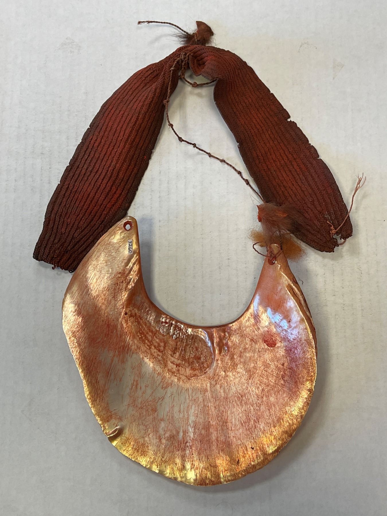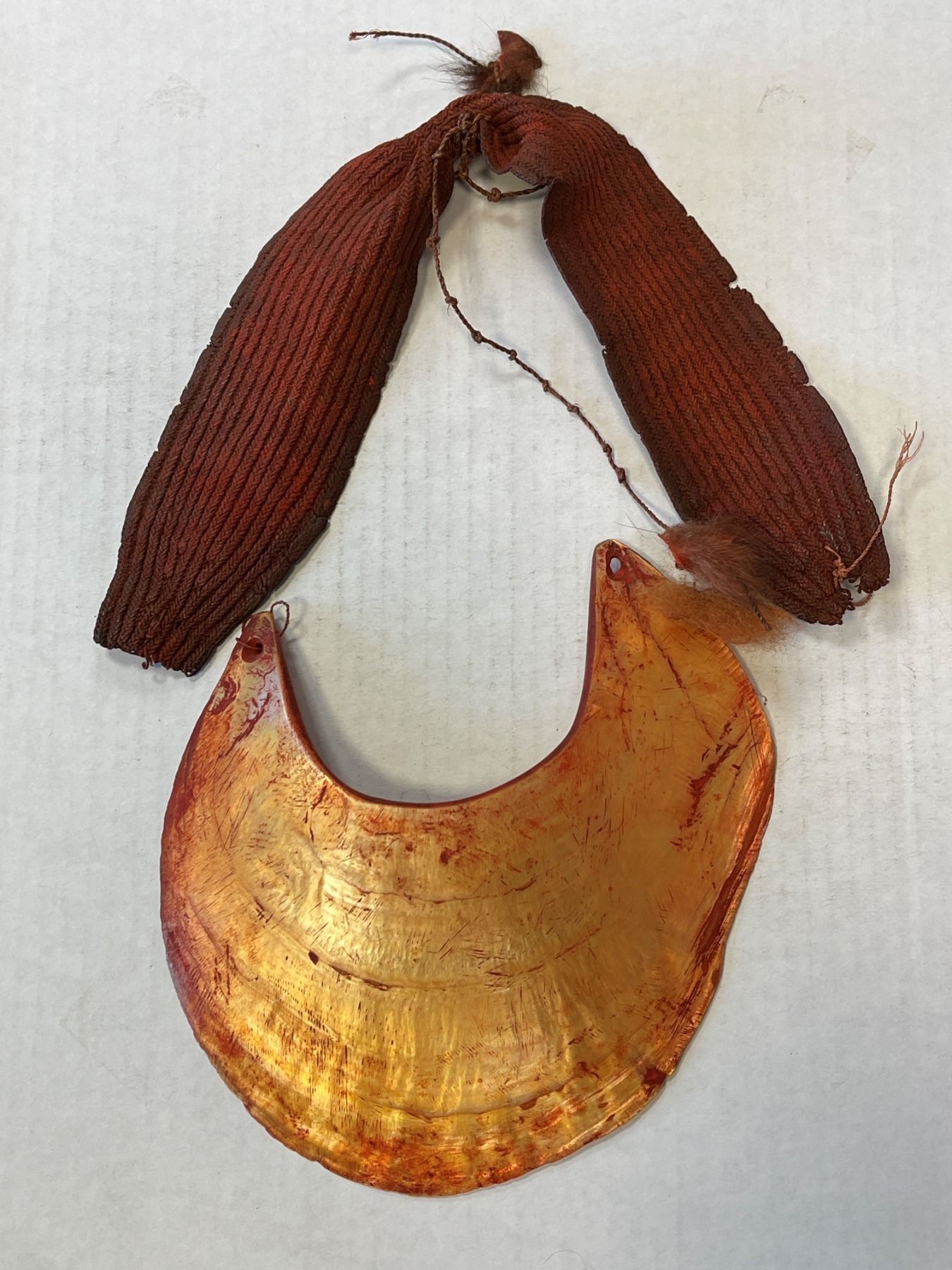 PAPUA NEW GUINEA: kina shell money (313g), Opitz p.177, ca. 195 x 165mm, made from a single shell of the gold-lipped pearl oyster fashioned into a crescent shape, pierced at the ends and attached with finely woven neck band (broken off), coated with red ochre powder, VF, ex Charles Opitz Collection. The gold-lipped pearl oyster (Pinctada maxima, "kina" in local languages) was once a currency of considerable value. Harvested from distant islands, it was most prized by the highland tribes and used for the purchase of pigs and brides, as well as display of male wealth. When the first Europeans advanced into the highlands in the early 1930's, few kina shells had yet found their way there from the coast; only some very rich men owned them. One ordinary shell was worth a whole pig weighing 200 lbs, and the price for a bride was two or three fragments of a shell, plus a pig and some other valuable items. Within 10 years, the value of the shells would plummet, as white prospectors began to give them out for services and food. A superior kina would only buy a small pig, and a good price for a bride had risen to 10 shells and 10 pigs. By the 1960's, marriage payments consisted of 60 to 100 shells plus 10 pigs, and by 1985 the shells were no longer used as currency. But such was the kina's cultural significance that it was adopted as the name of the national currency in 1975 (= 100 toea).