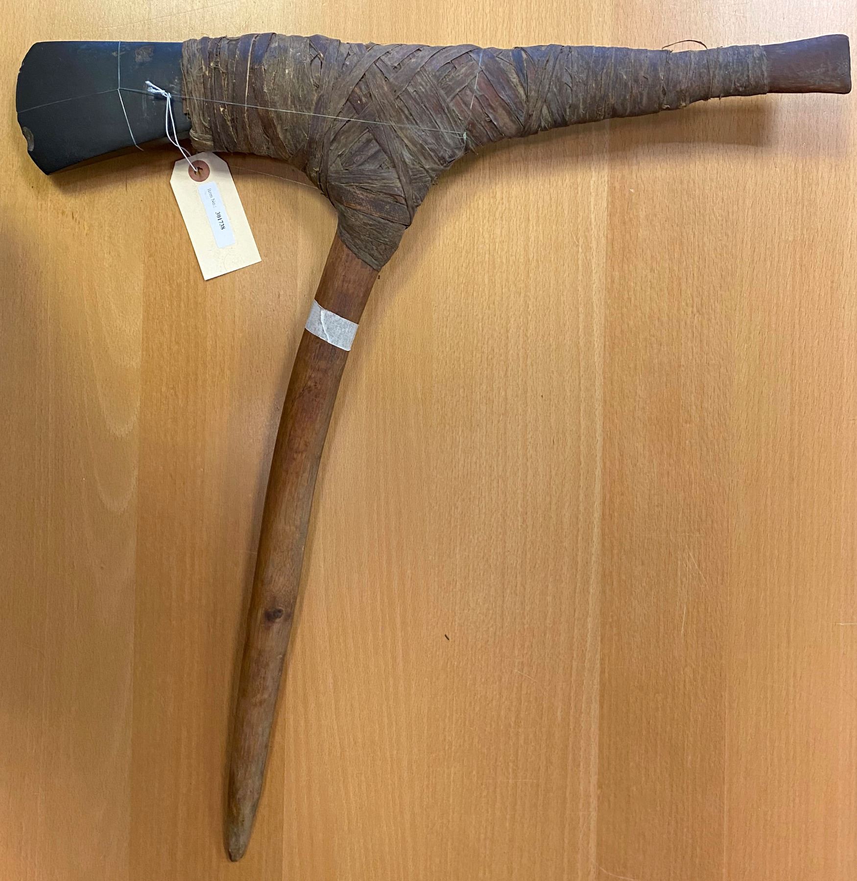 PAPUA NEW GUINEA: stone axe (1144g), Opitz p.23 (plate example), ca. 54 x 55.5cm, comprising a greenstone blade affixed to a protruding wooden butt and curved handle with bark fiber, small chip on blade, used as a tool and exchanged for shells, pigs, salt and other valuables, Choice VF, ex Charles Opitz Collection.