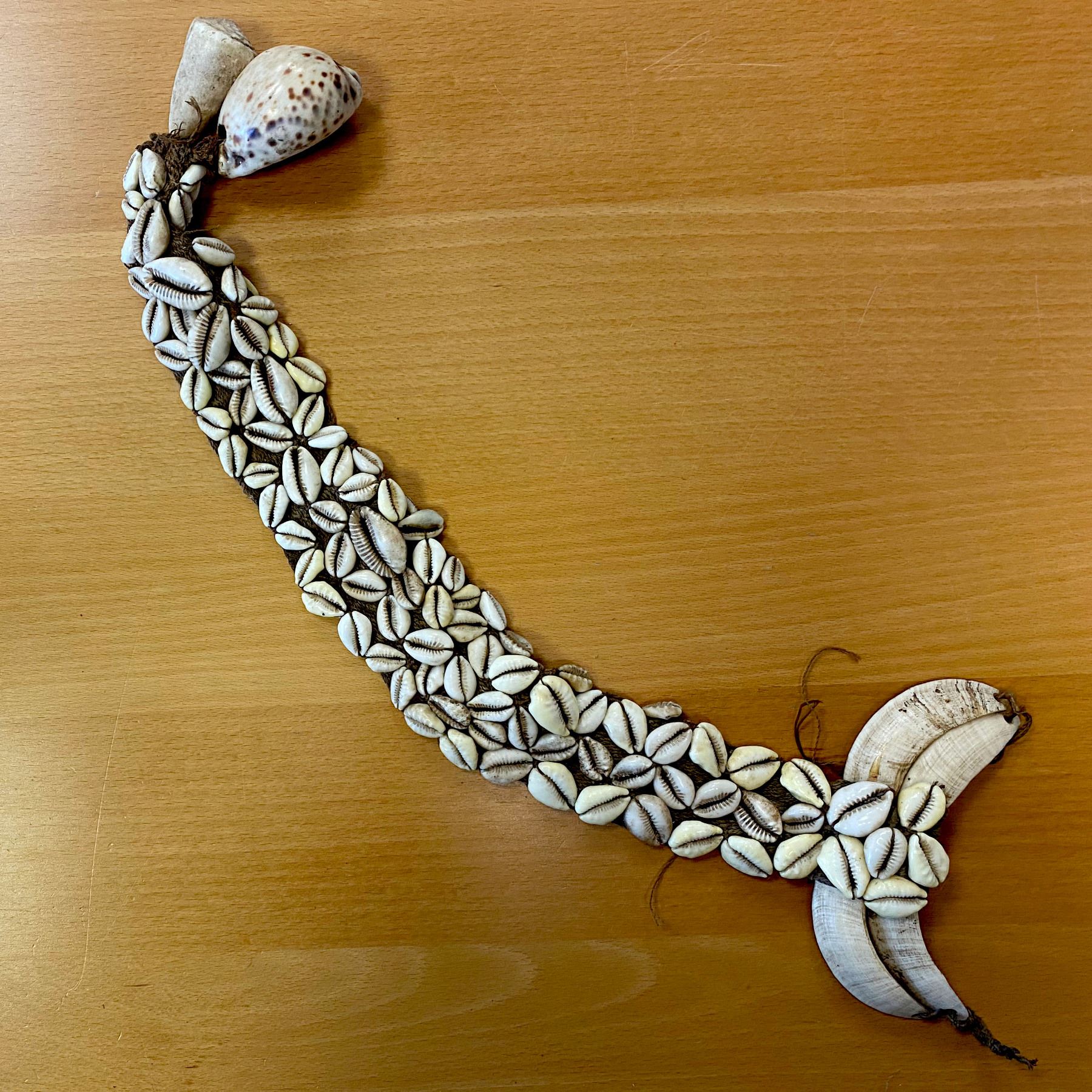PAPUA NEW GUINEA: tusk and shell ornament (368.62g), Opitz p.72 (plate example), comprising a 48 x 6cm woven band adorned with dozens of large nassa shells, affixed at the top to two pairs of conjoined boar tusks, and at the bottom to two large shells (conus and cowry), worn around the neck and used as money by the native people, a very nice specimen! Choice VF, ex Charles Opitz Collection. Acquired by the consignor in 1973 in Kubkain Village on the Sepik River in East Sepik Province.