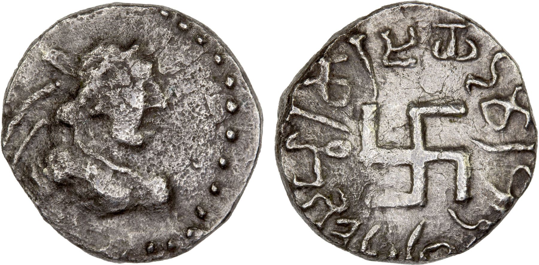 PARATARAJAS: Hvaramira, ca. 165-175, AR drachm (3.67g), Pieper-816 (old volume, this piece), diademed bust right // swastika right, Brahmi legend hvaramirasa yolamiraputrasa paratajasa; bold strike, complete legend, XF, ex Wilfried Pieper Collection.