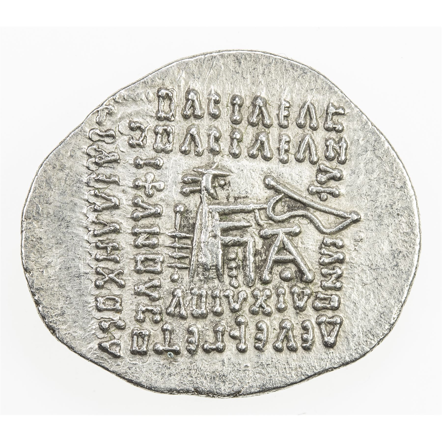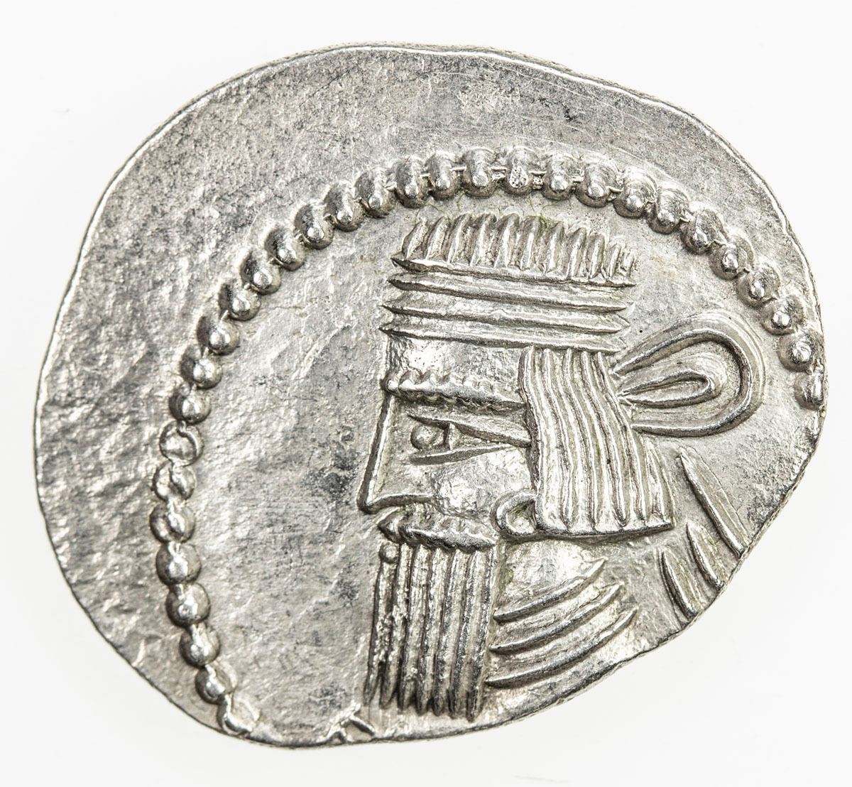 PARTHIAN KINGDOM: Artabanos II, AD 10-38, AR drachm (3.67g), Mithradatkart, Shore-341/345, long square-cut beard, broad flan, showing the entire reverse, gorgeous strike, choice EF.