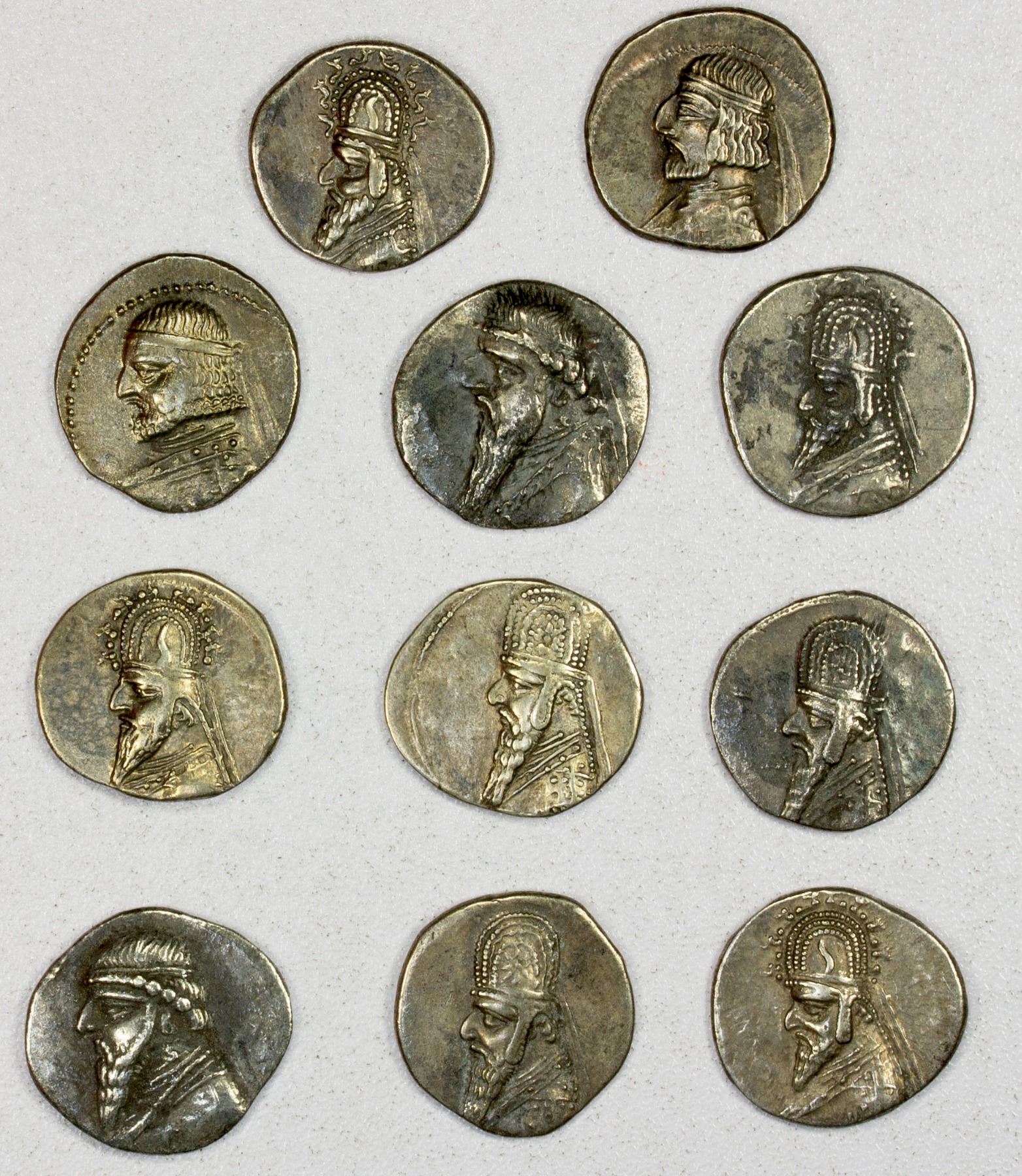 PARTHIAN KINGDOM: LOT of 11 silver drachms, including Mithradates II, ca. 123-88 BC (3 pcs); Gotarzes I, ca. 95-87 BC (4), and Orodes I, ca. 90-77 BC (4); average VF, a couple nicer; retail vaue $600, lotof 11 pieces.