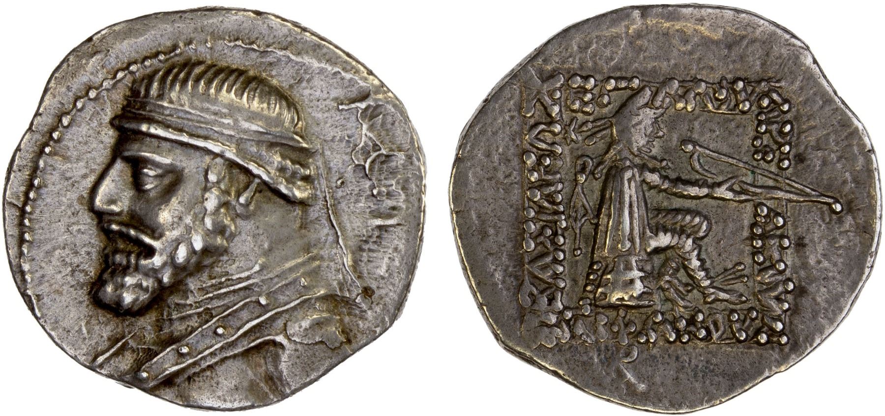 PARTHIAN KINGDOM: Mithradates II, ca. 123-88 BC, AR drachm (4.19g), Rhagai, cf. Shore-75, Sellwood-24.20, diademed bust left, monograms behind // archer seated right, four-line inscriptions with guide lines, monogram to inner left and in exergue, VF-XF, ex Dr. Vincent John Adams Flynn Collection, ex David Sellwood Collection (Baldwin's Auction 96, part of Lot 3143).