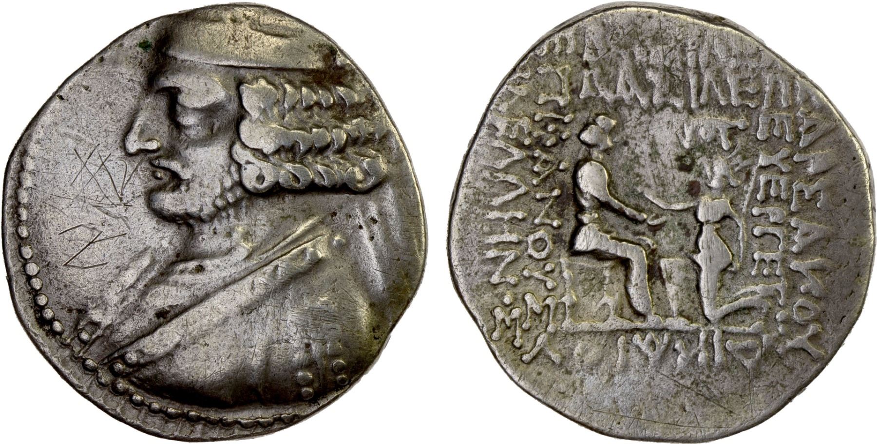 PARTHIAN KINGDOM: Orodes II, ca. 57-38 BC, AR tetradrachm (15.58g), Seleukeia on the Tigris, Shore-209, Sellwood-45var (no exergue symbol), diademed bust left, wearing spiral torque // king seated right, receiving Tyche kneeling left and extending right hand, monogram above, faint graffiti on obverse, F-VF, ex Dr. Vincent John Adams Flynn Collection, ex David Sellwood Collection (Baldwin's Auction 96, Lot 3115).