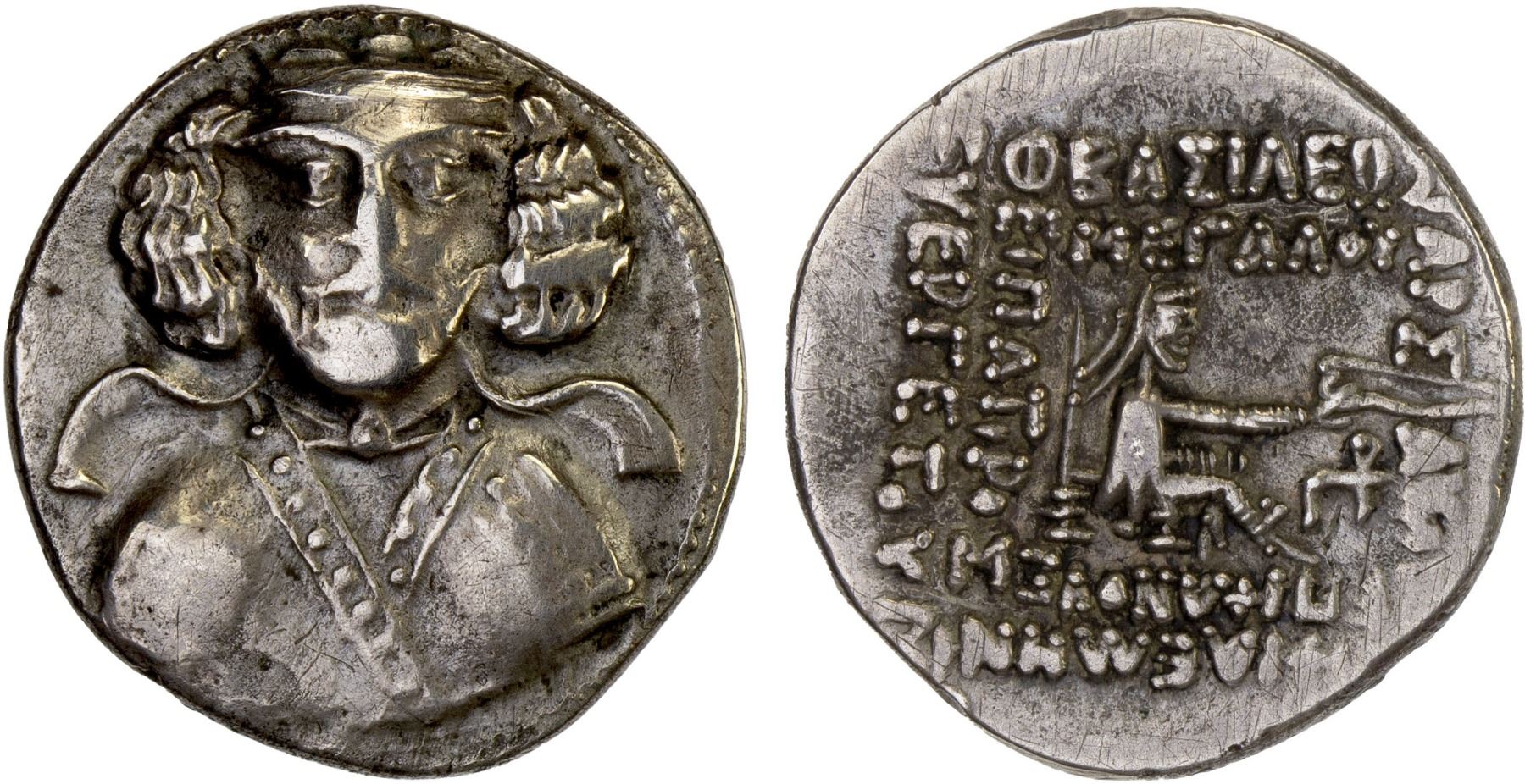 PARTHIAN KINGDOM: Phraates III, ca. 70-57 BC, AR drachm (3.70g), Rhagai, Shore-165, Sellwood-35.7var (reverse inscriptions), diademed bust facing, wearing necklet with medallion // archer seated right, mintmark below bow, seven-line inscriptions, lightly polished, F-VF, ex Dr. Vincent John Adams Flynn Collection (Baldwin's Auction 96, part of Lot 3154).