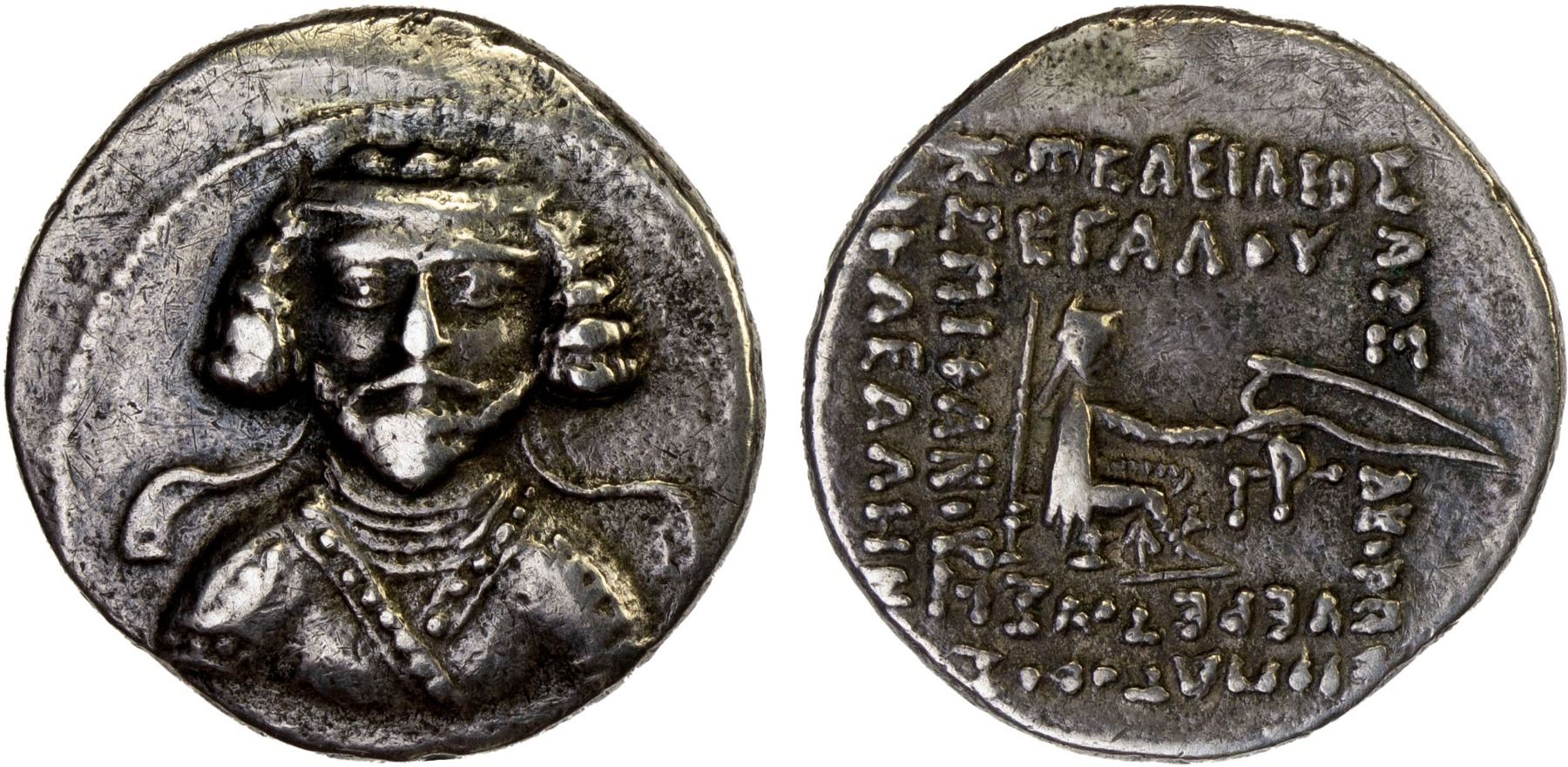 PARTHIAN KINGDOM: Phraates III, ca. 70-57 BC, AR drachm (3.83g), Rhagai, Shore-165var (reverse inscriptions), Sellwood-35.7, diademed bust facing, wearing necklet with medallion // archer seated right, mintmark below bow, seven-line inscriptions, obverse lightly polished, VF, ex Dr. Vincent John Adams Flynn Collection (Baldwin's Auction 96, part of Lot 3154).