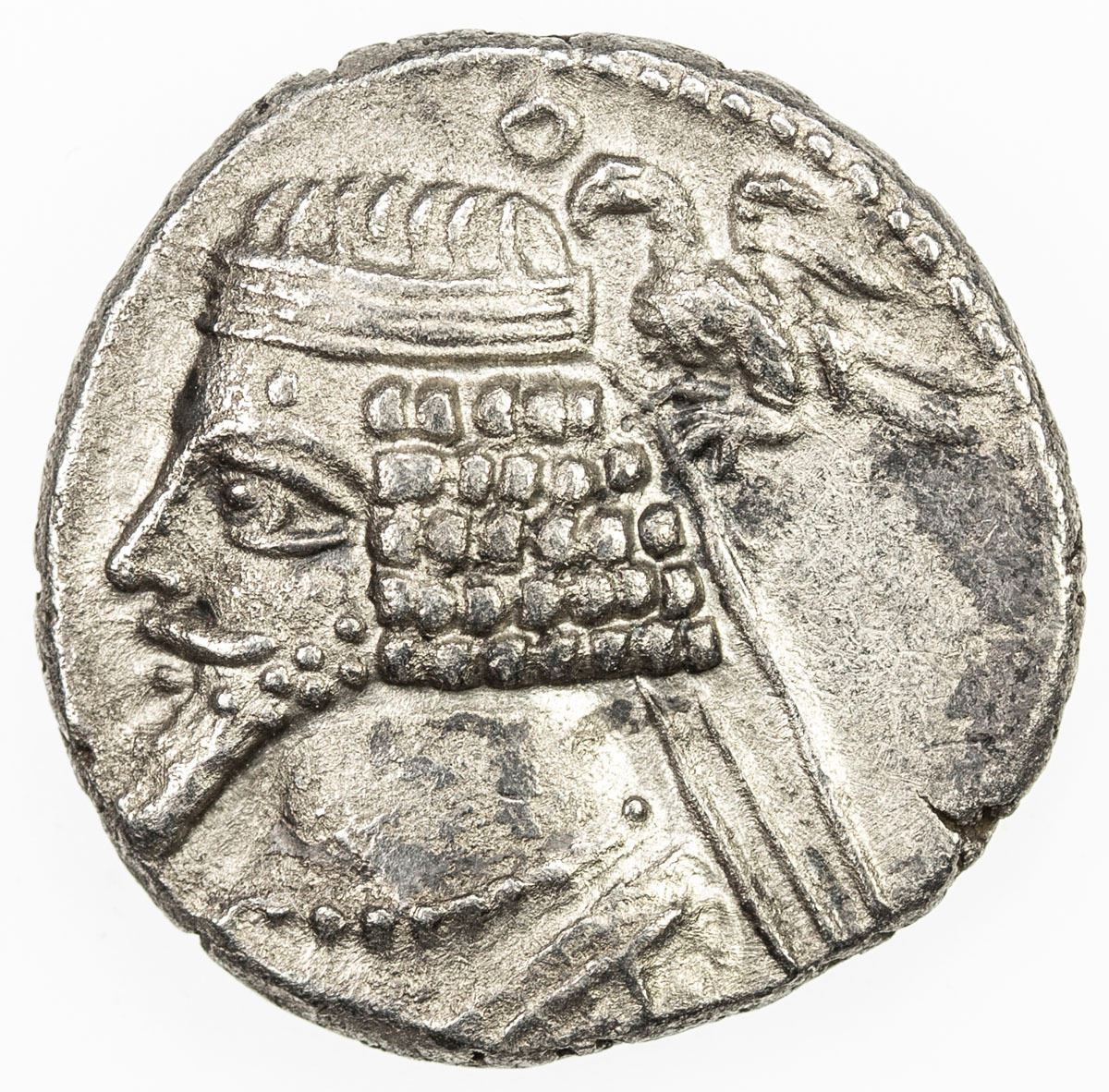 PARTHIAN KINGDOM: Phraates IV, 38-2 BC, AR drachm (3.59g), Court mint at Rhagai, Shore-281, Sunrise-392, diademed and draped bust left, with royal wart, eagle above to right with wreath // archer seated right on throne, bold strike with rare full eagle, EF.
