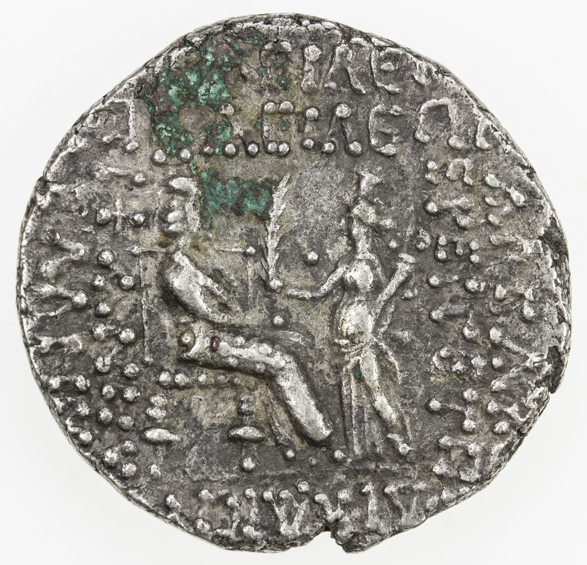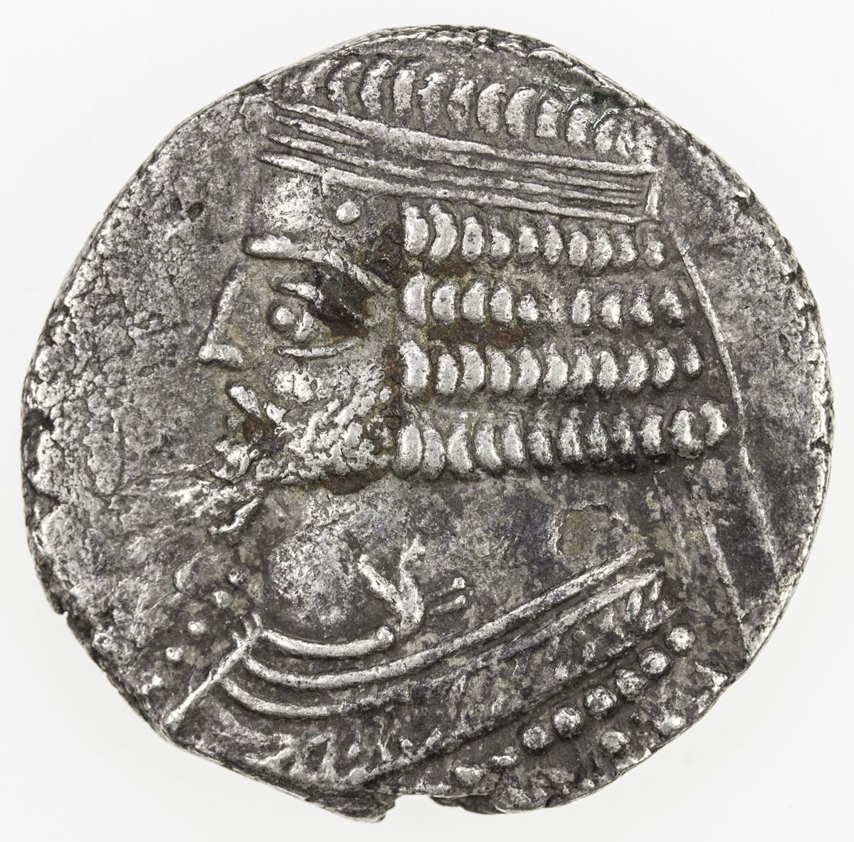 PARTHIAN KINGDOM: Phraates IV, c. 38-2 BC, AR tetradrachm (10.59g), Seleukeia, SE288 (=22/21 BC), Shore-271/72, bust left with square-cut beard // king seated on throne, receiving palm branch offered him by Tyche, who holds the cornucopia, small adhesions on reverse, VF to EF.