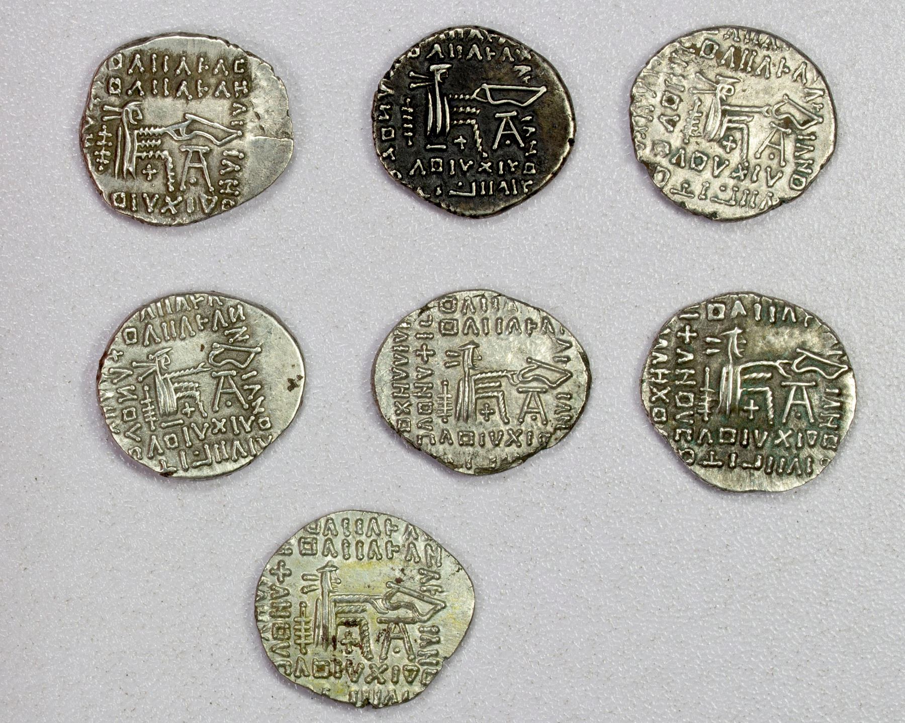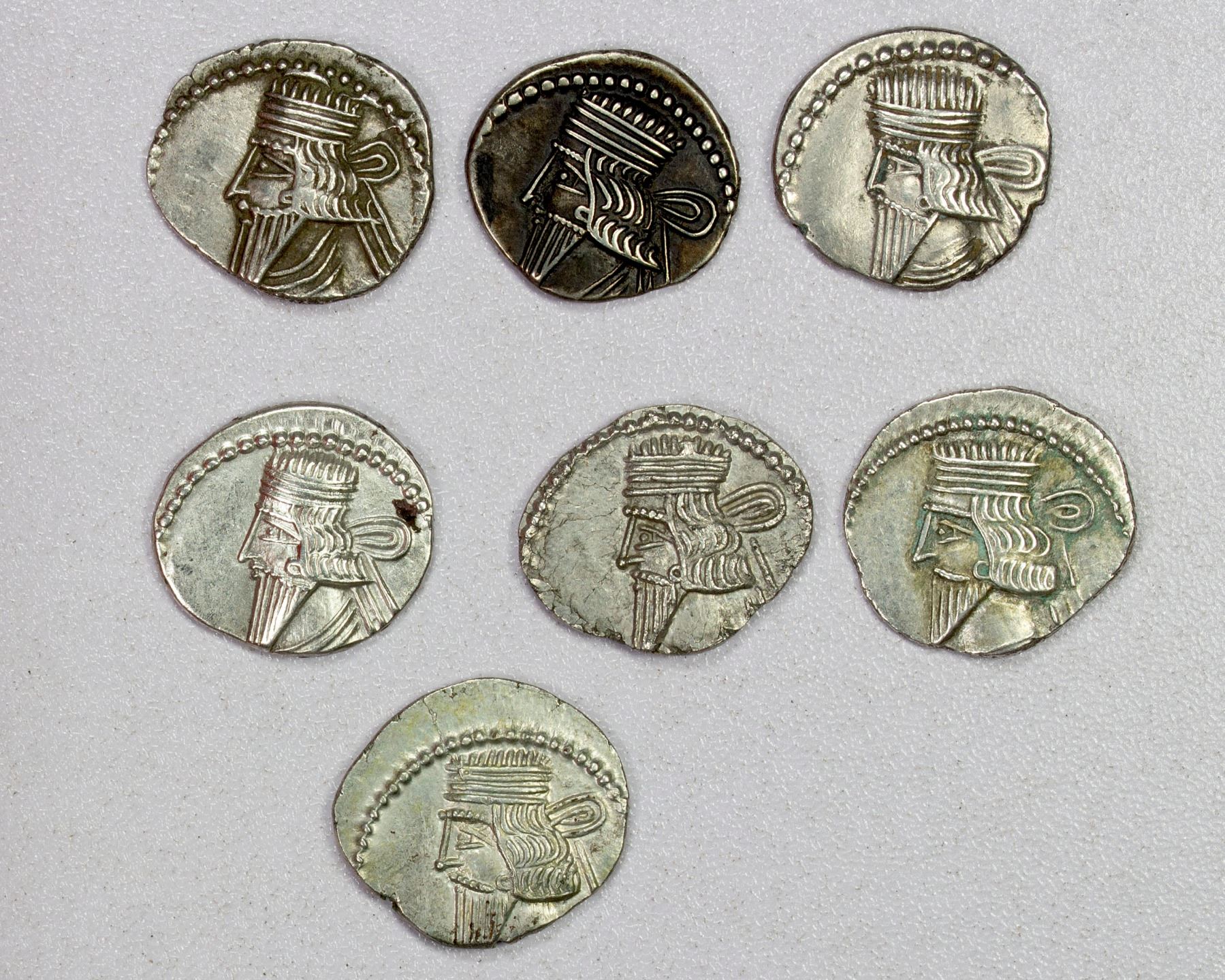 PARTHIAN KINGDOM: Vologases III, 105-147, LOT of 7 silver drachms, type Shore-413/16: long pointed beard, fine-style reverse, grades choice VF to EF; retail value $550, lot of 7 pieces.