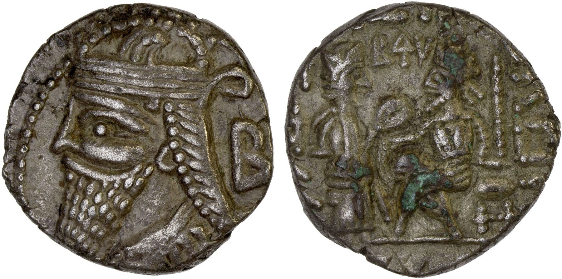 PARTHIAN KINGDOM: Vologases IV, 147-191 AD, BI tetradrachm (13.33g), Seleukia on the Tigris, SE492 (180/1 AD), Shore-432, diademed bust left, the letter B to right // king seated left, receiving wreath from Tyche standing, BQY (date) above, a few spots of old corrosion on reverse, VF, ex Virgil Brand Collection (Glendining March 1987).