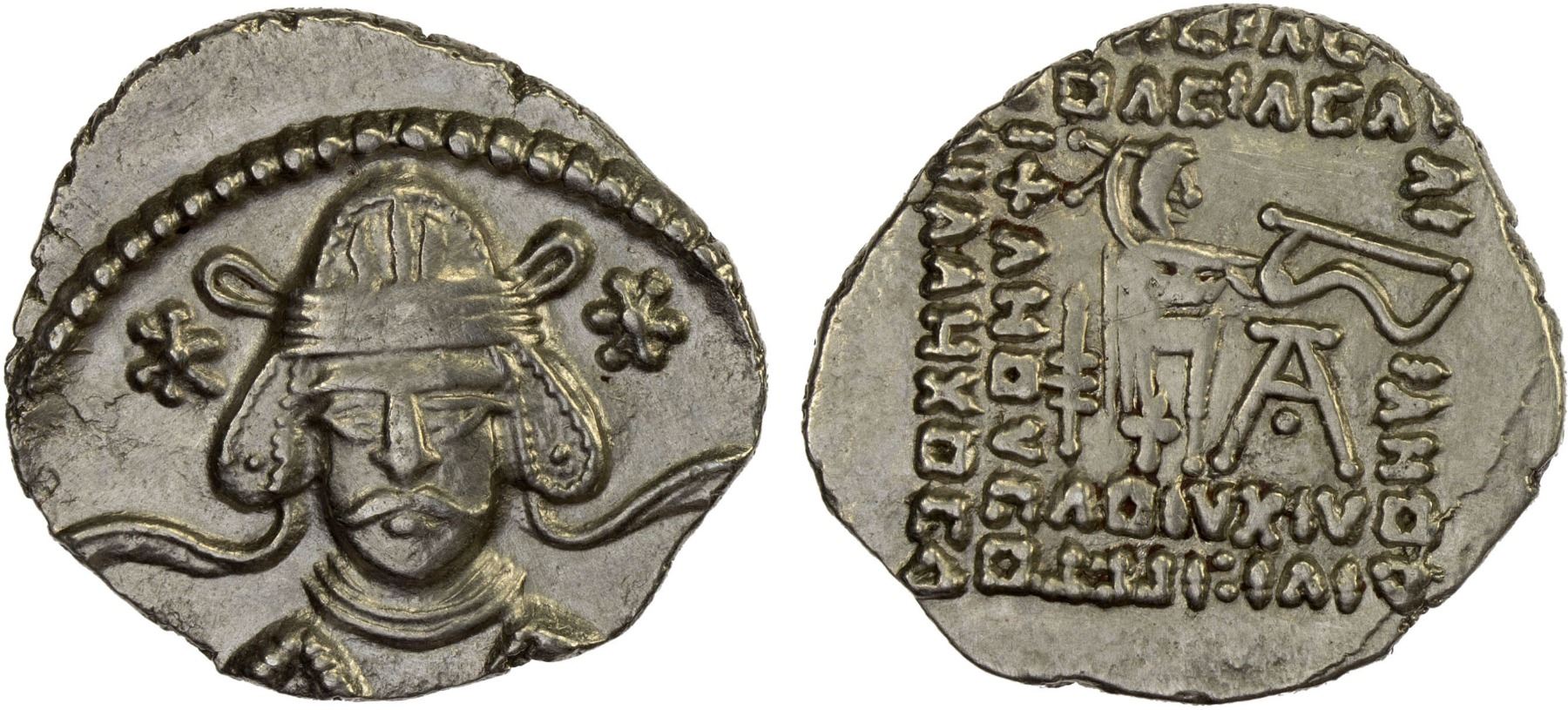 PARTHIAN KINGDOM: Vonones II, 51 AD, AR drachm (3.20g), Ekbatana, Shore-368, Sell-67.1, bust facing, wearing tiara, star to either side // archer seated right, 7-line legend, light hairlines, Choice VF. This type is also assigned to the rebel Meherdates (49-50 AD).
