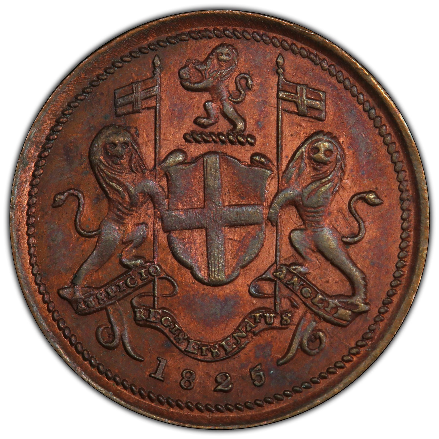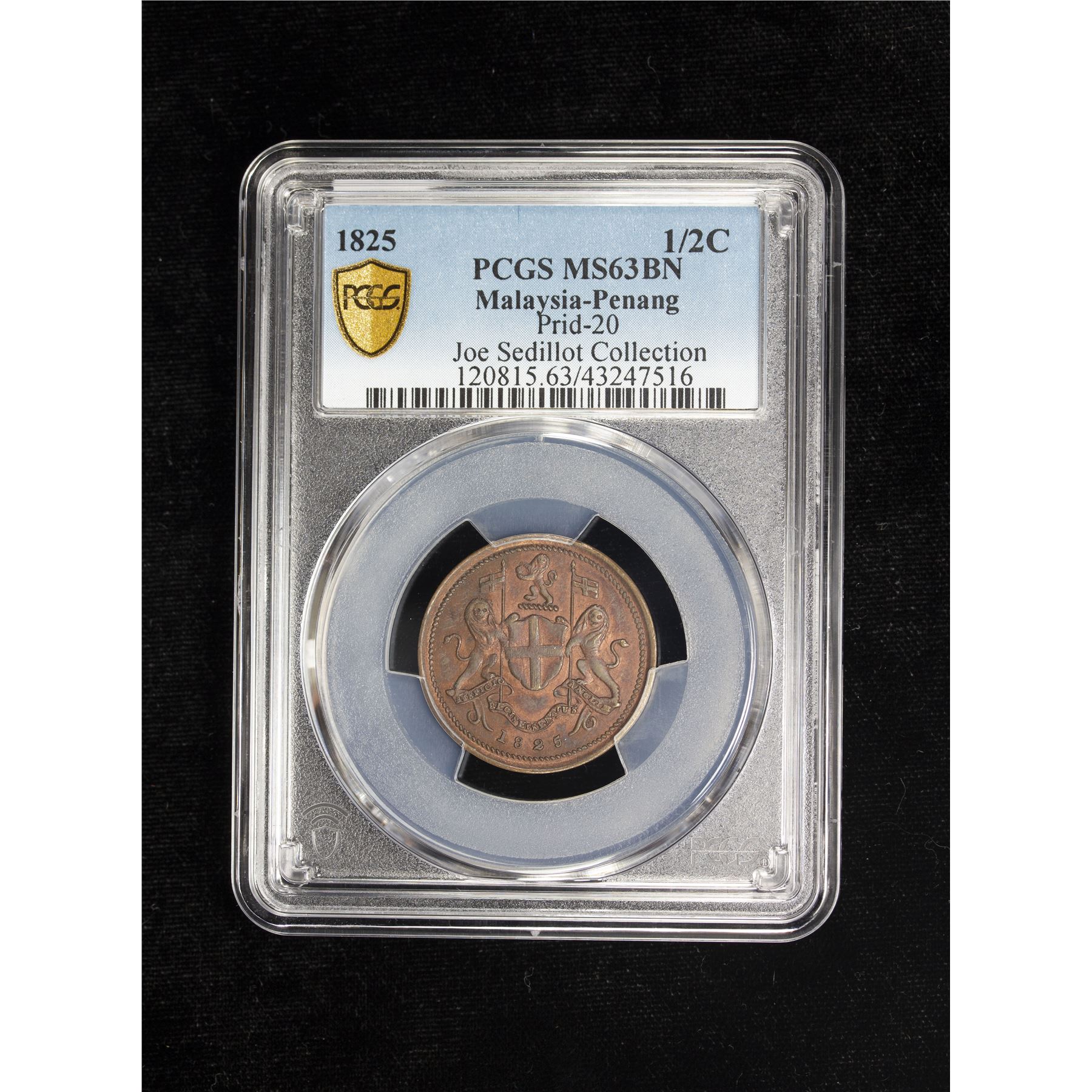 PENANG: AE ½ cent, 1825, KM-13, Prid-20, East India Company issue, a lovely quality mint state example! PCGS graded MS63 BN, ex Joe Sedillot Collection. Issued under the authority of the Prince of Wales Island Presidency (1805-30), which was headed by a governor, and assisted by a council of two or three officials. During the Presidency period Penang became a major trading center, having quickly overtaken the Dutch facilities in Malacca.