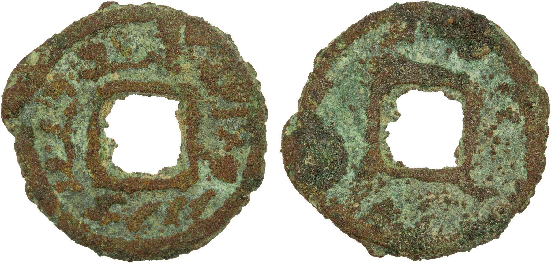 PENDJIKENT: Bidyan, ca. 690-709, AE cash (2.36g), Zeno-44835, Smirnova-998, Sogdian legend for "Bidyan master of Panch" // large tamgha of Pendjikent around the central square hole, VG-F, RR. The ruler's name has been updated on Zeno as Chekin Chur Bilgä.