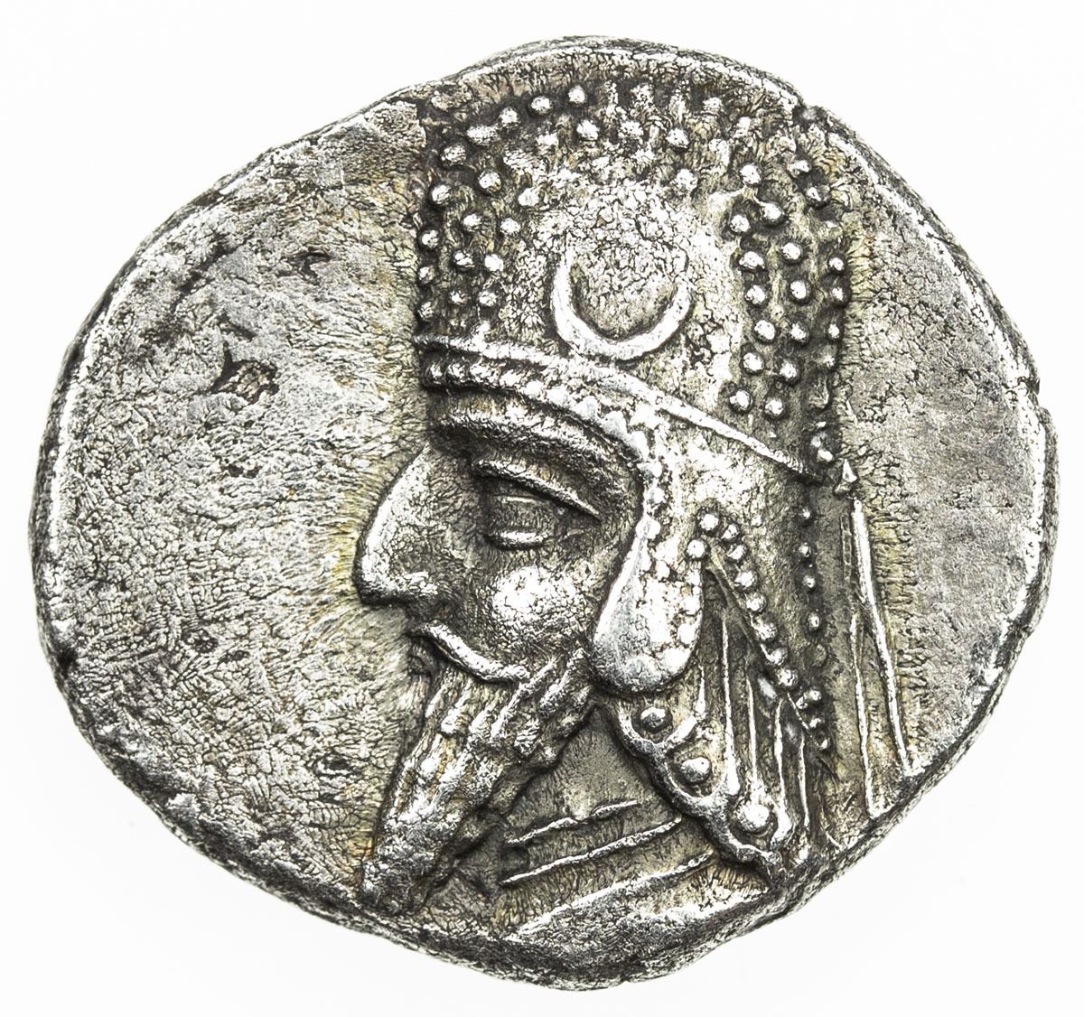 PERSIS KINGDOM: Darev (Darios) II, 1st century BC, AR drachm (4.09g), Sunrise-590, Alram-564, bearded bust left, wearing diadem and Parthian-style tiara with crescent and three rows of pellets // ruler standing right, holding scepter and sacrificing before altar, VF to EF.