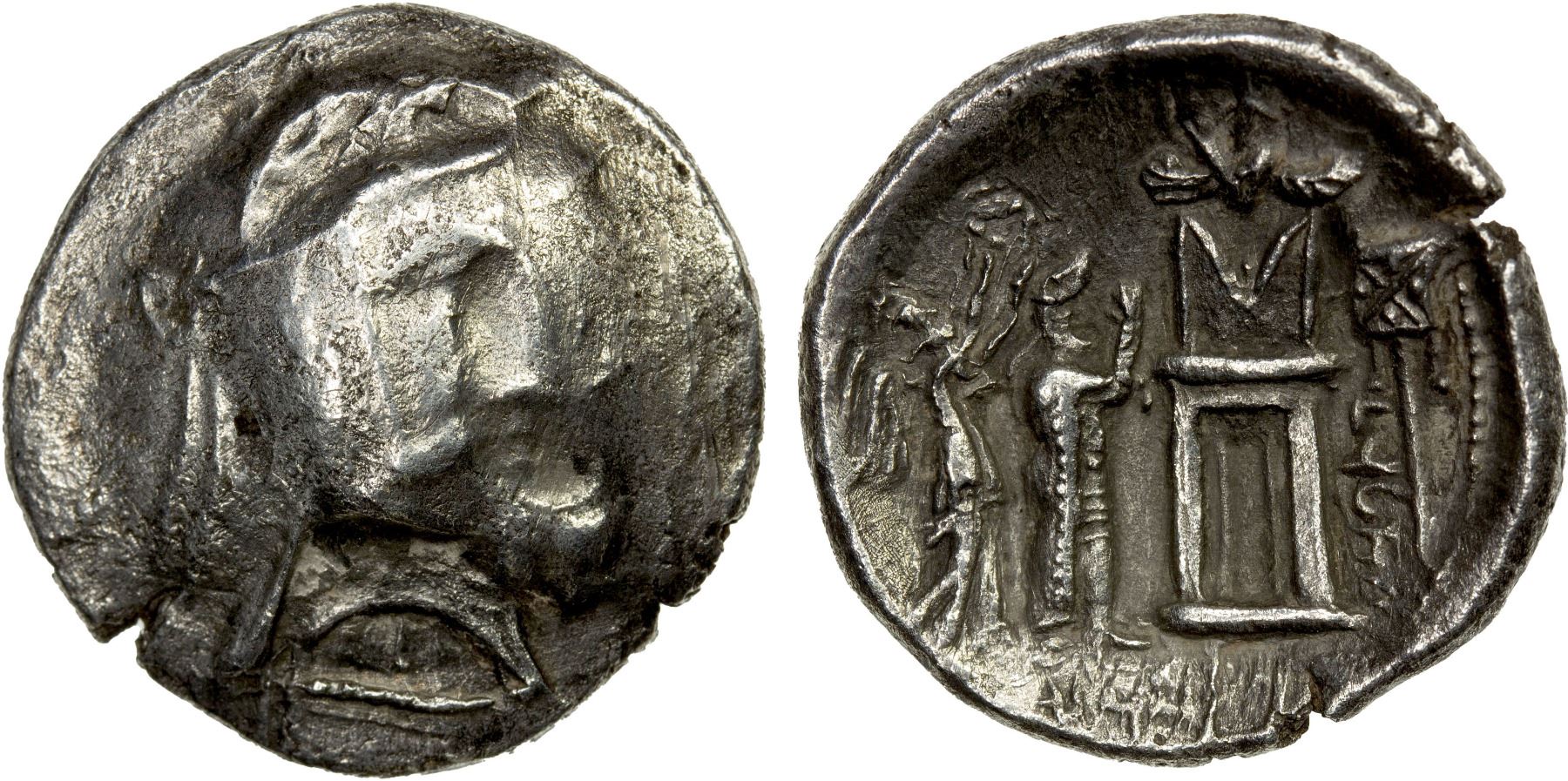 PERSIS KINGDOM: Vadfradad I, early 2nd century BC, AR drachm (3.95g), Alram-545, king's bust right, with luxurious moustache, wearing kyrbasia & earring // fire-temple of Ahura Mazda, king left, diademed by Nike, and standard right, with Aramaic legends; weak obverse, wonderful reverse, VF, RR.