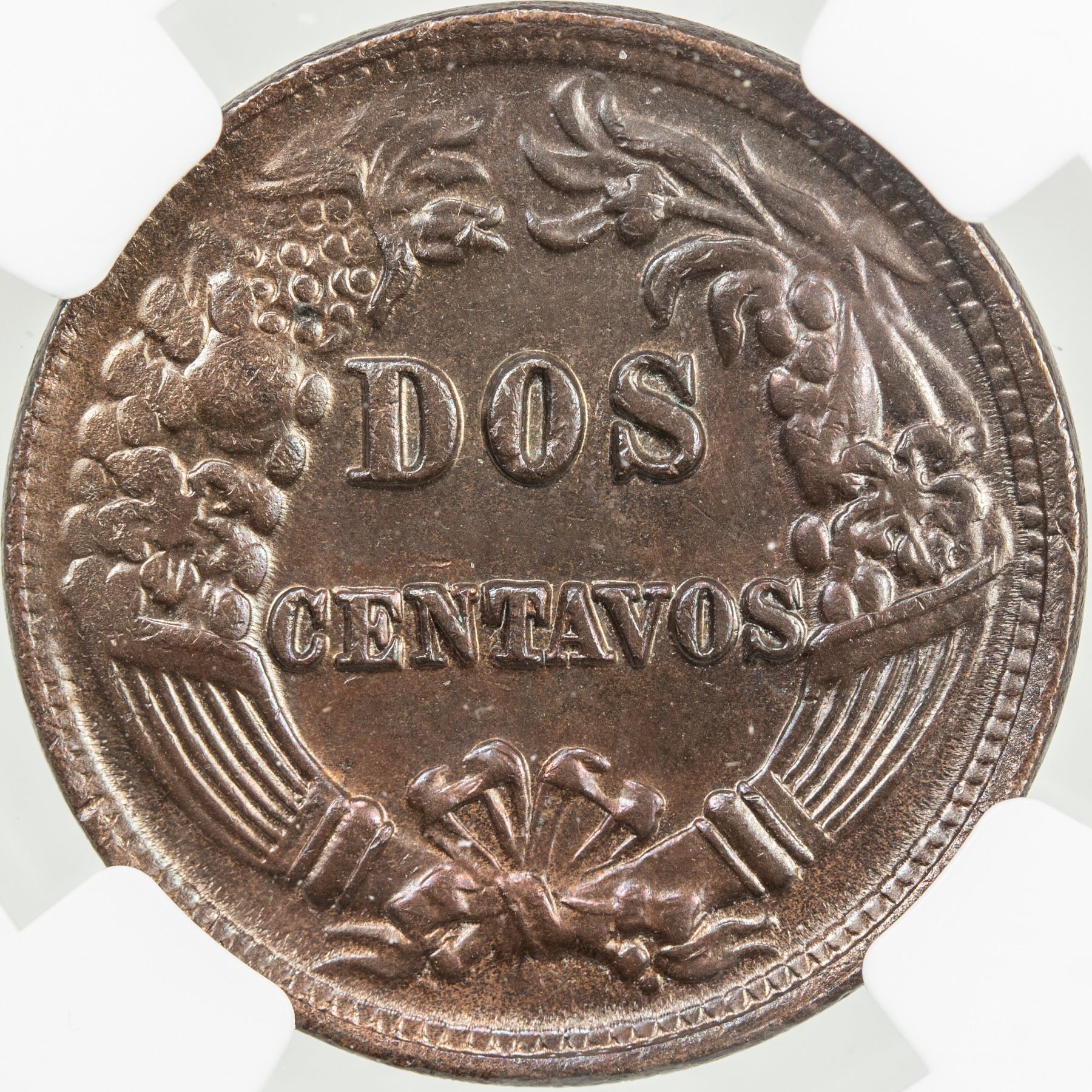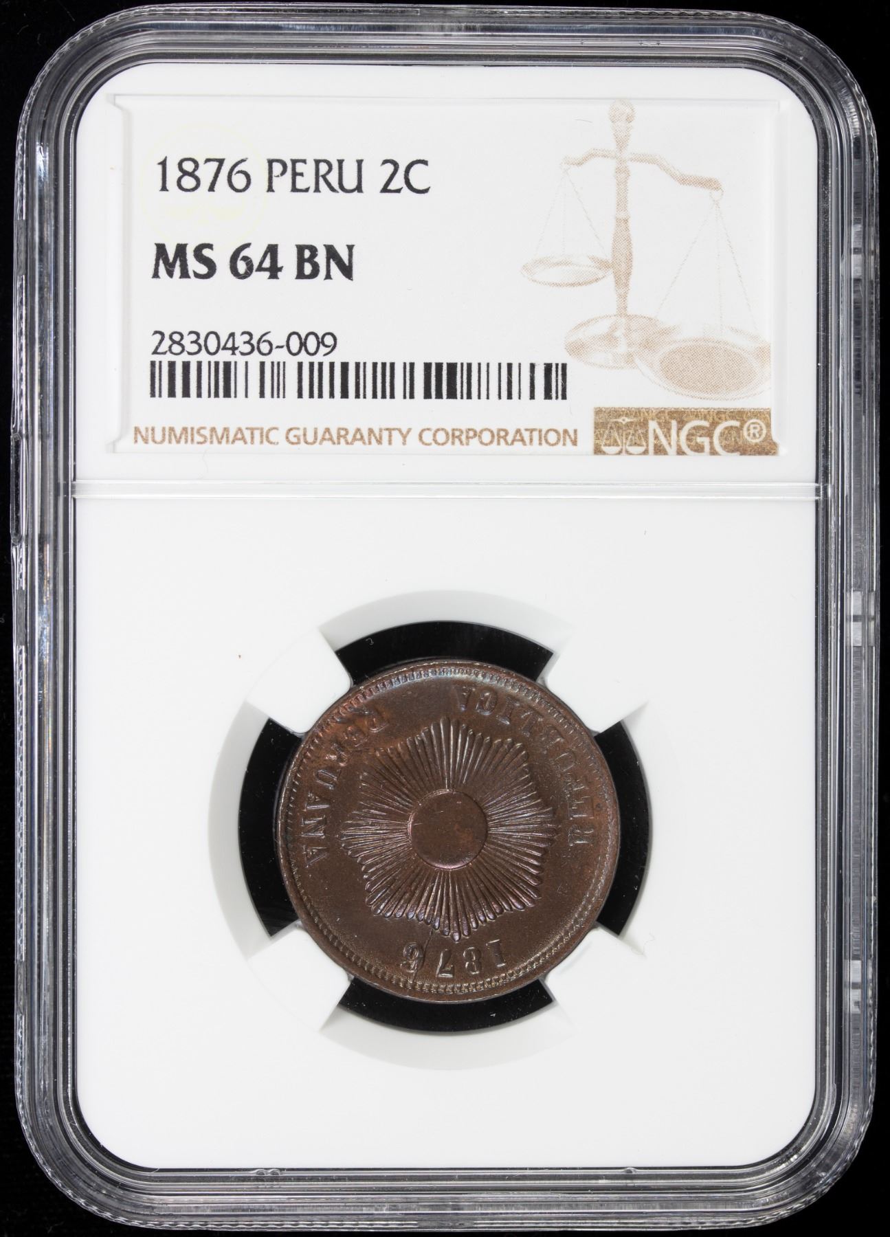 PERU: 2 centavos, 1876, KM-188.1a, NGC graded MS64 BR.