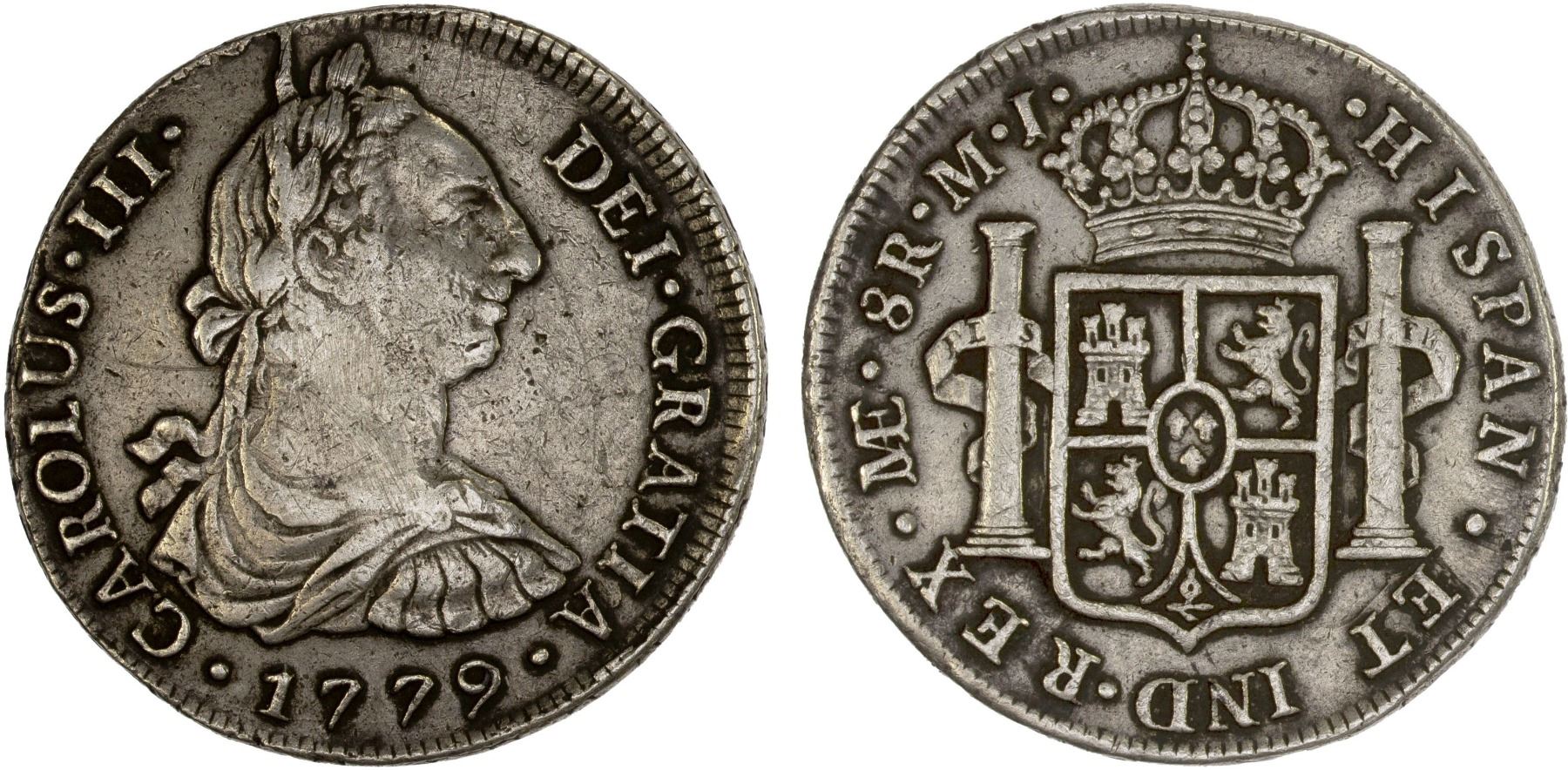 PERU: Carlos III, 1759-1788, AR 8 reales, 1779-LIMAE, KM-78, assayer MJ, fine obverse scratches, interesting die crack from portrait to rim, VF.