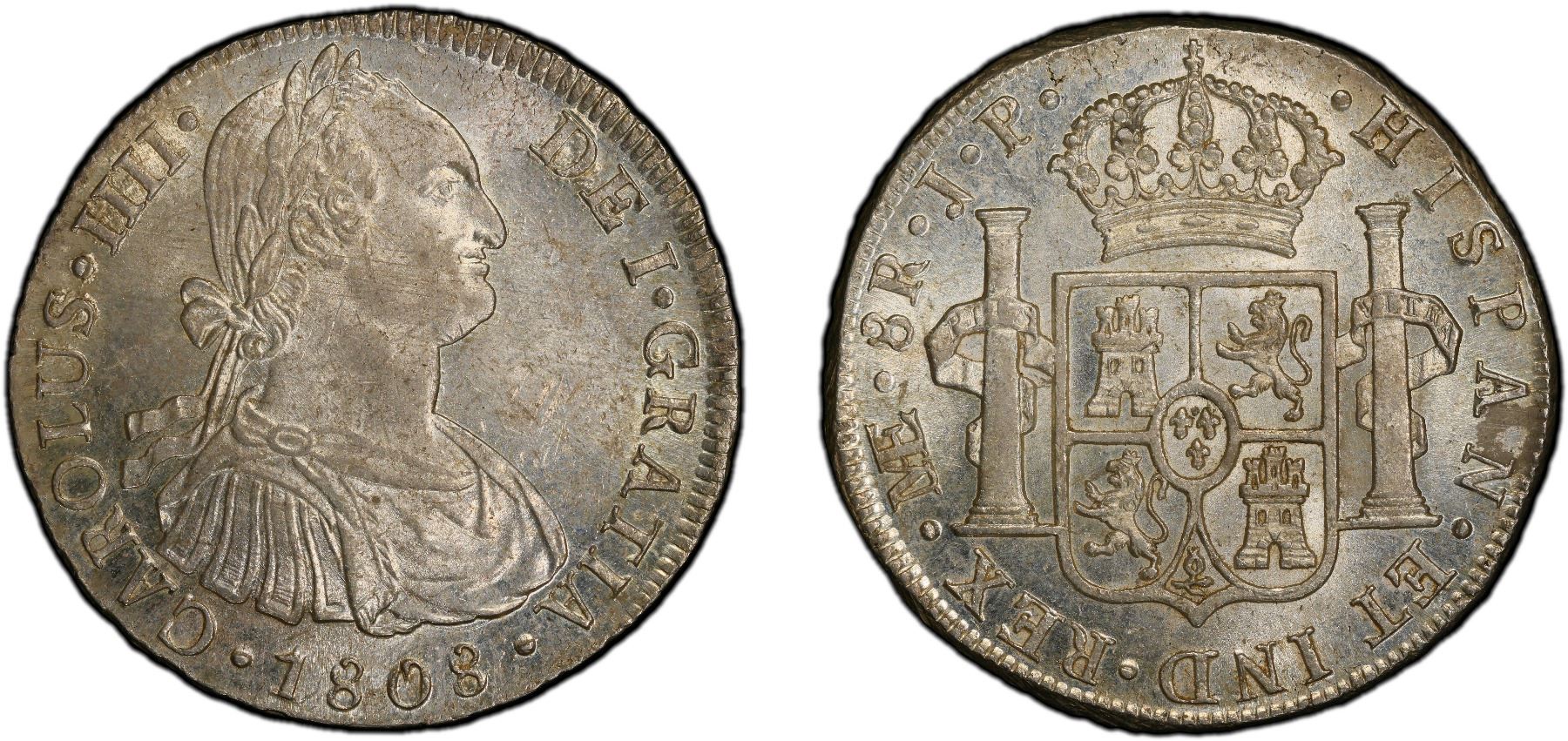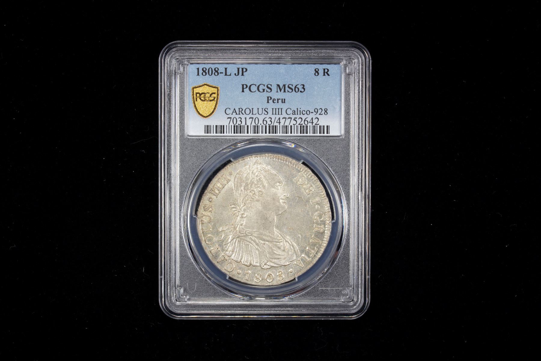 PERU: Carlos IV, 1788-1808, AR 8 reales, 1808-LIMAE, KM-97, AC-928, assayer JP, natural obverse planchet striations, wonderful full luster, PCGS graded MS63.