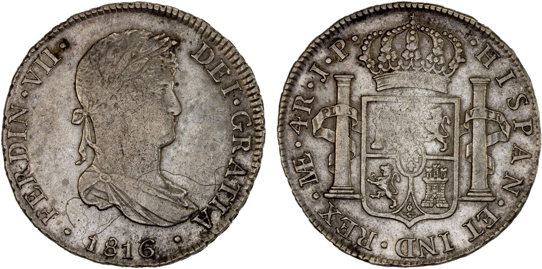 PERU: Fernando VII, 1808-1822, AR 4 reales, 1816-LIMAE, KM-116, assayer JP, some obverse hairlines, softly struck centers, struck through threads on obverse, some luster, XF.