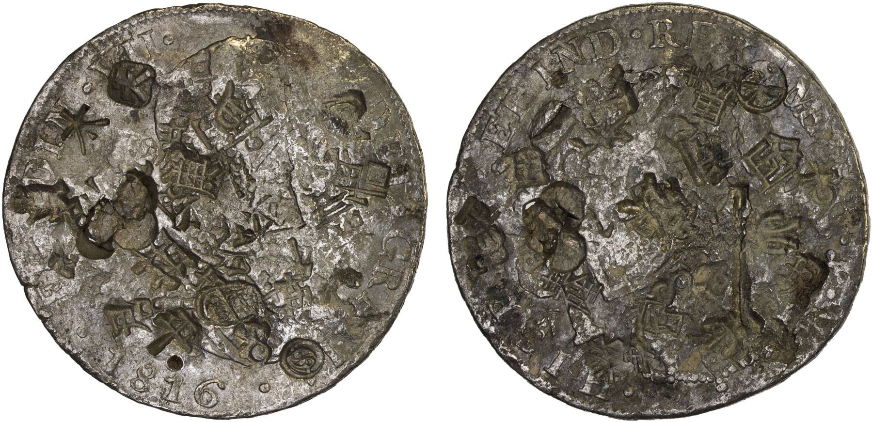 PERU: Fernando VII, 1808-1825, AR 8 reales, 1816-LIMAE, KM-117, assayer JP, with many Chinese merchant chopmarks on both sides (including a yin-yang symbol), VF to XF.