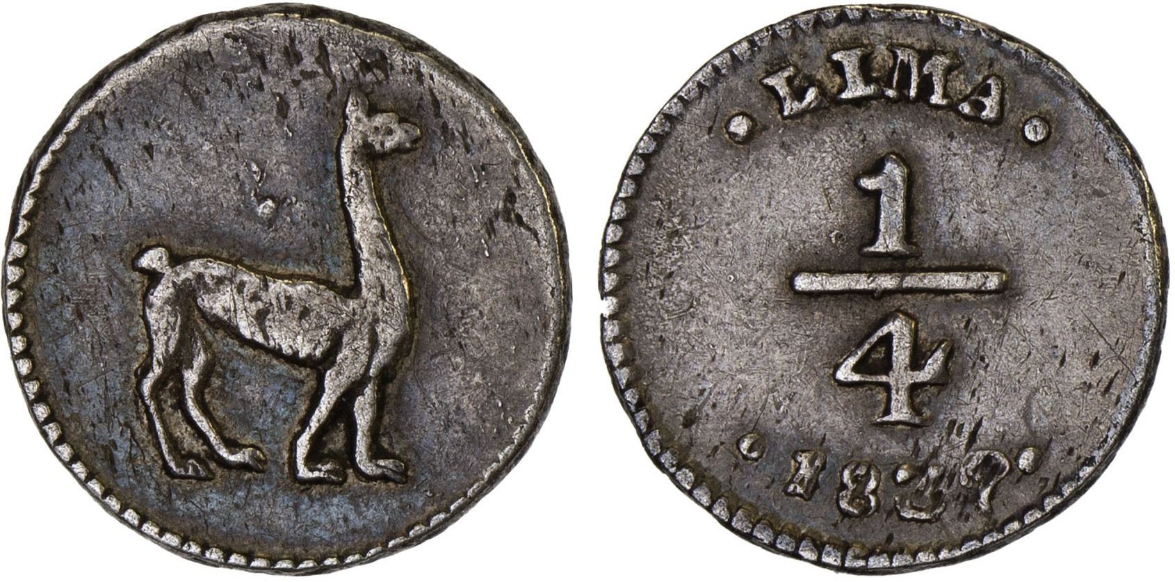 PERU: Republic, AR 1/4 real, Lima, 1839, KM-143.1, llama, small planchet flaws, light hairlines, VF.