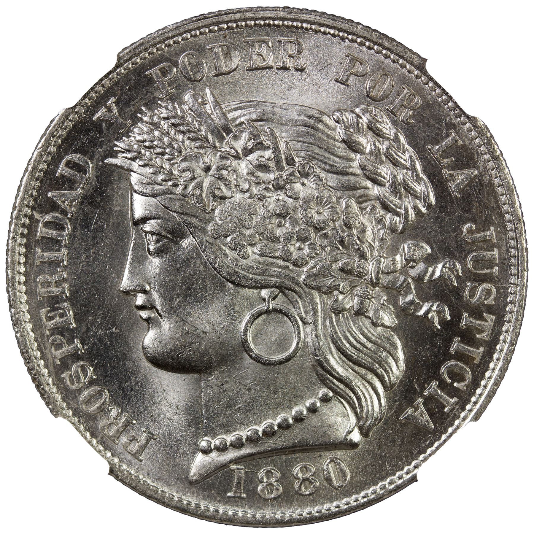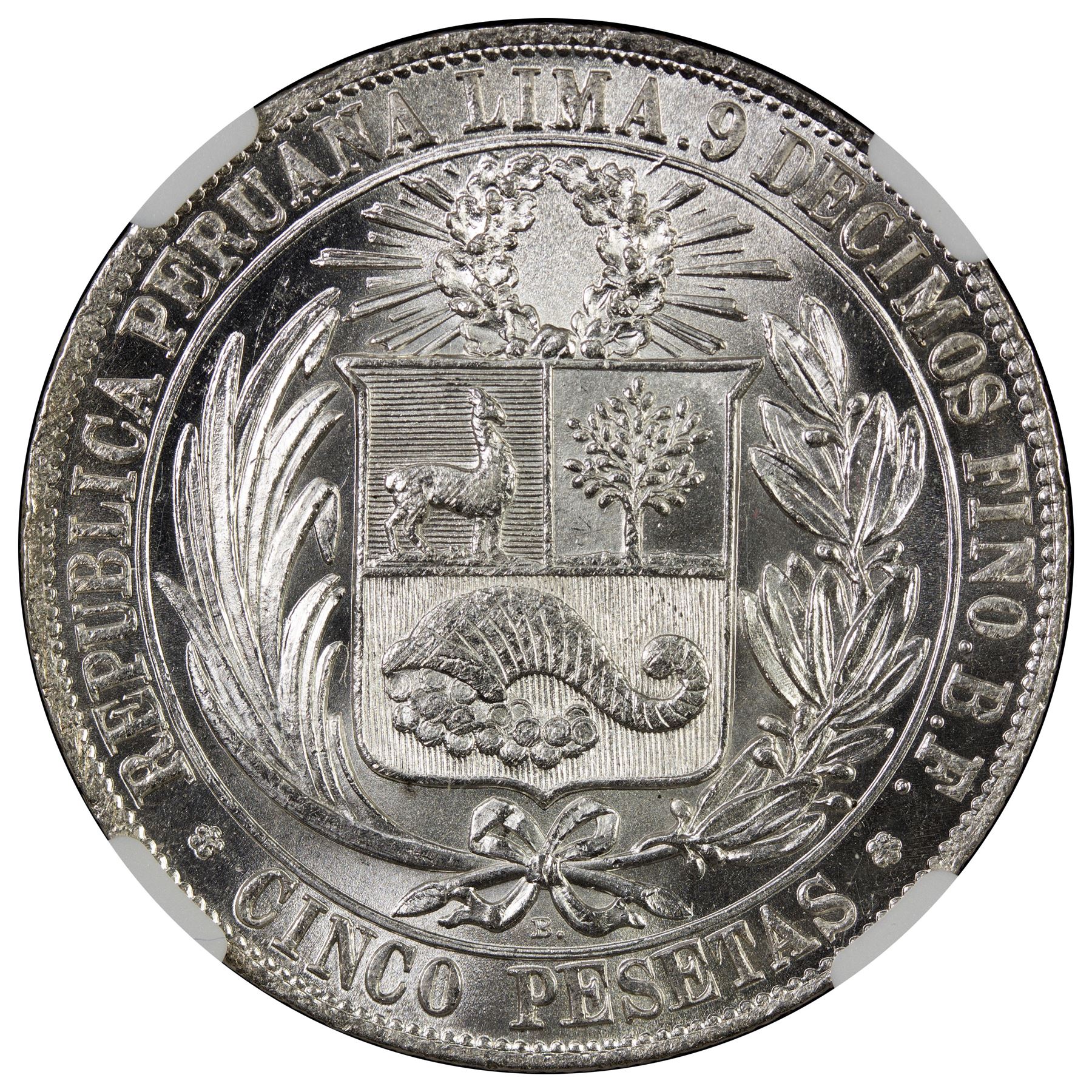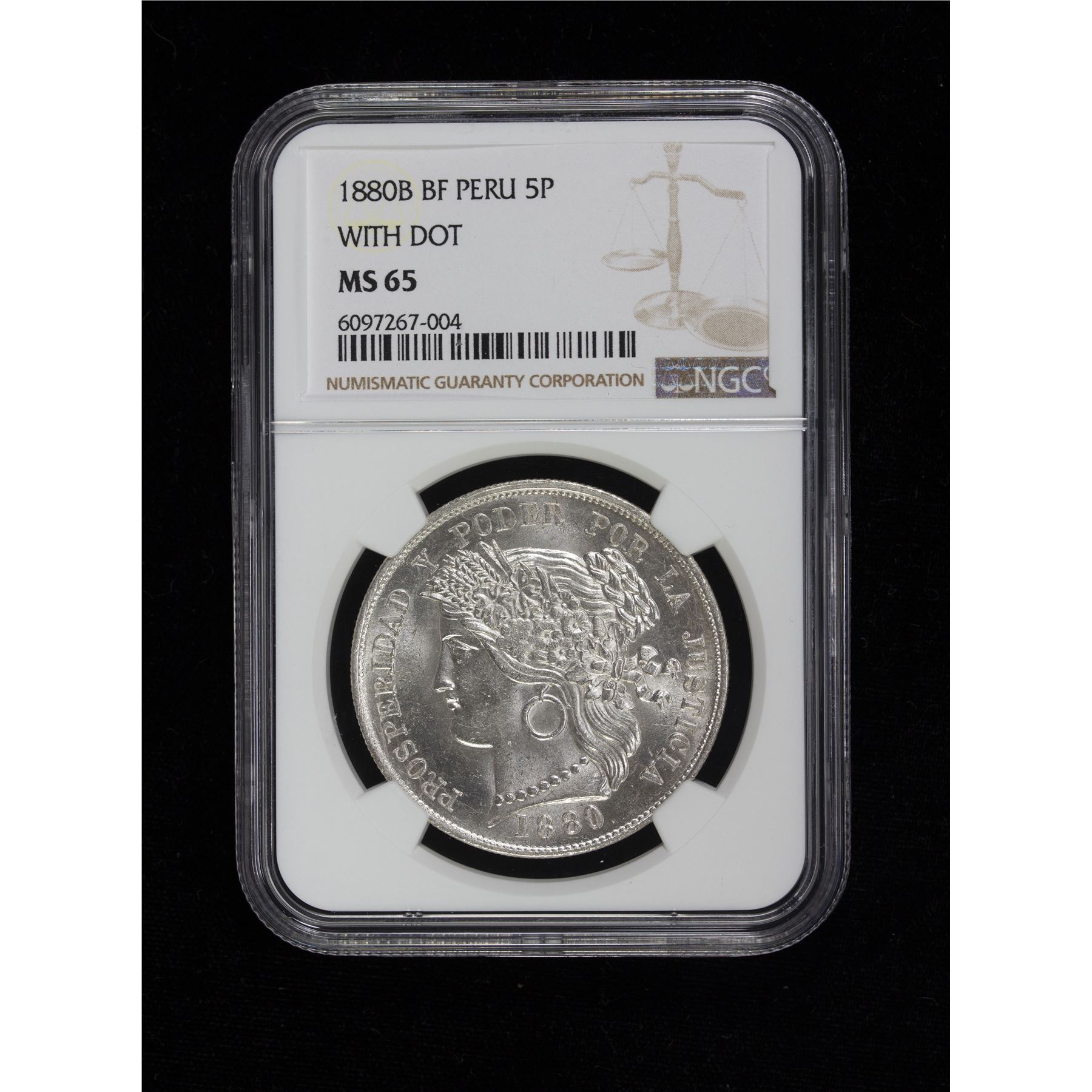 PERU: Republic, AR 5 pesetas, 1880, KM-201.2, with dot after B below wreath variety, a superb brilliant white lustrous example! NGC graded MS65.
