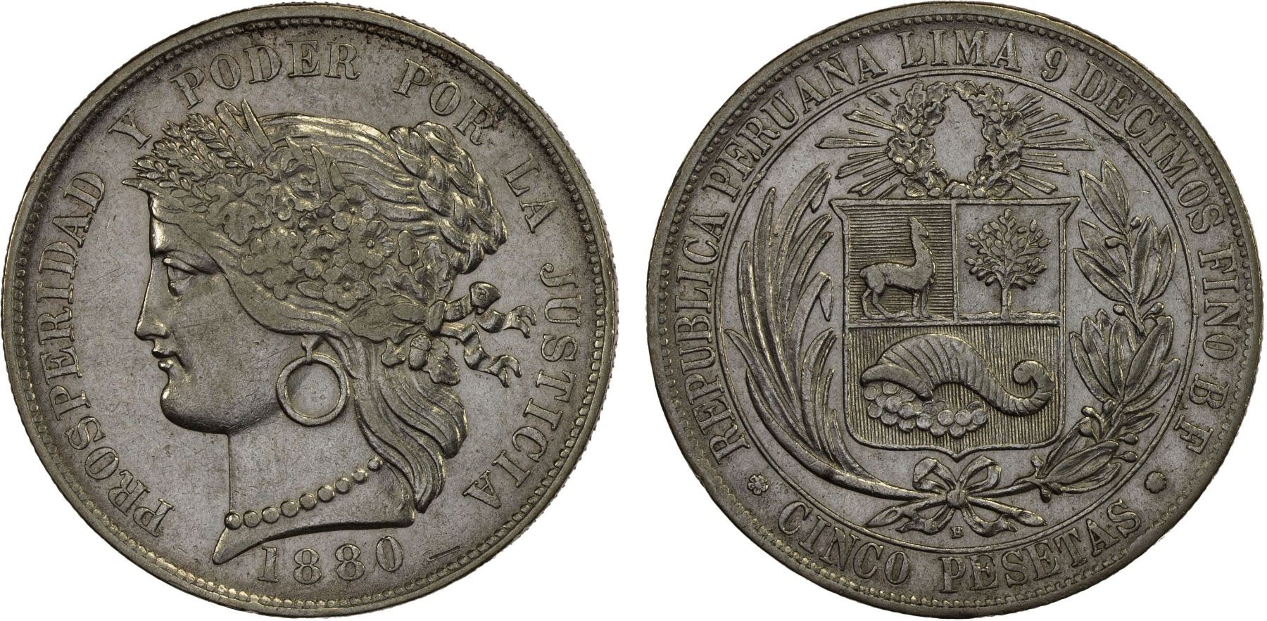PERU: Republic, AR 5 pesetas, 1880, XF