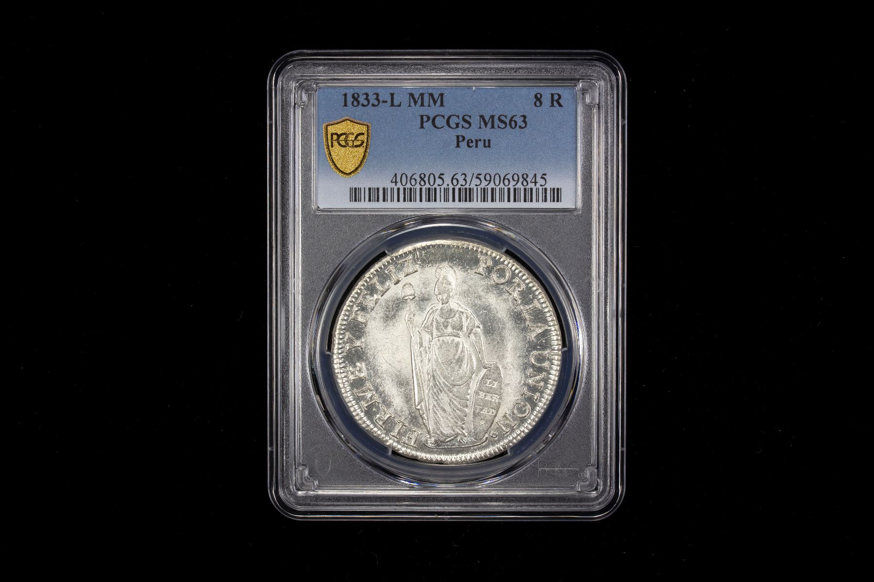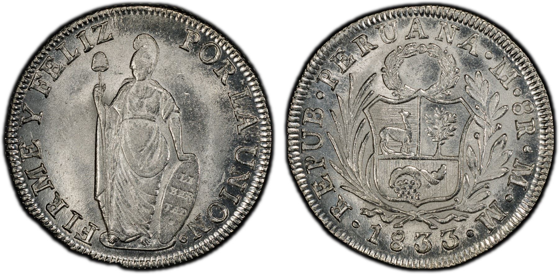 PERU: Republic, AR 8 reales, Lima, 1833, KM-142.3, assayer MM, a lovely lustrous mint state example! PCGS graded MS63.