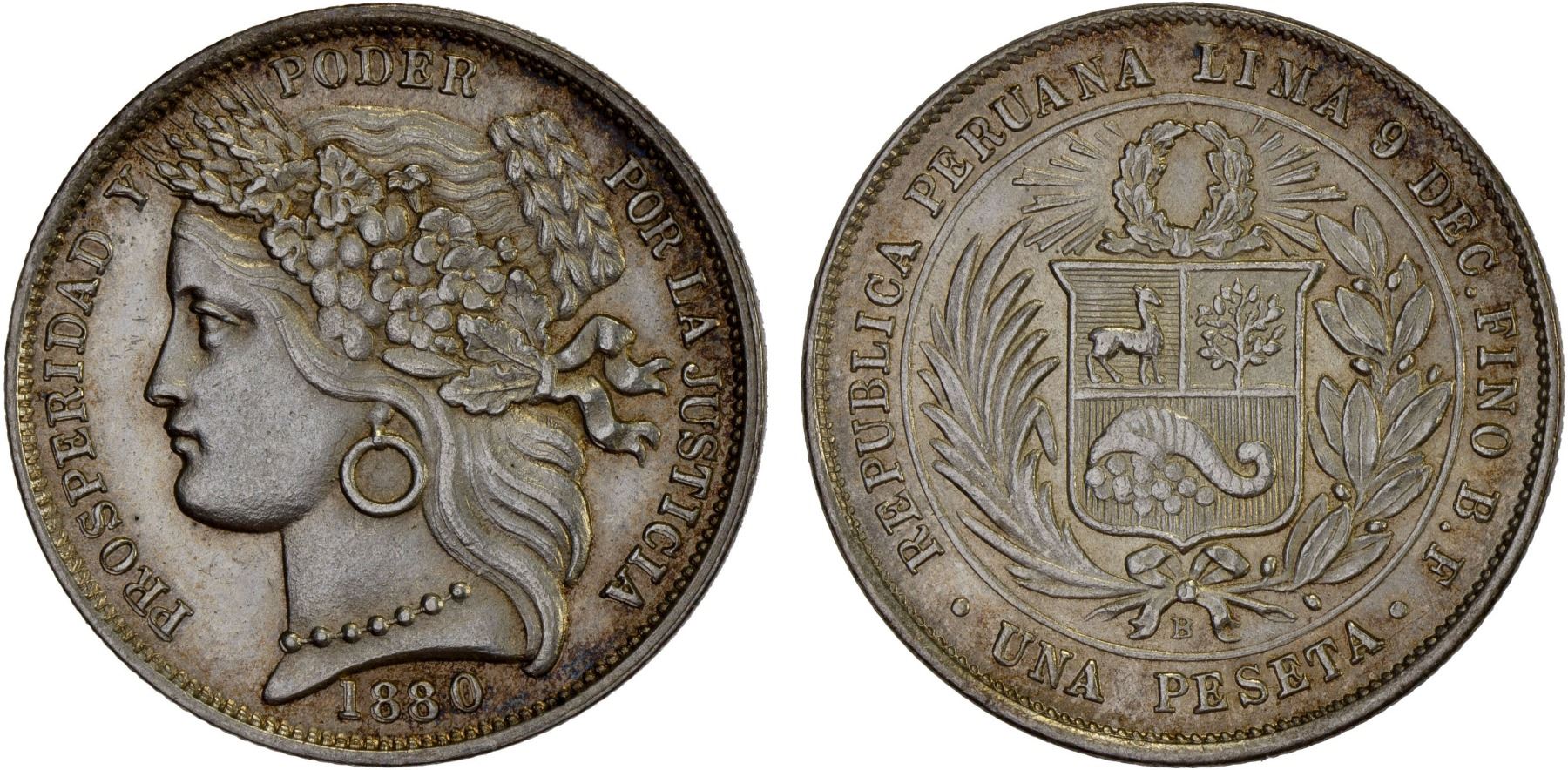 PERU: Republic, AR peseta, 1880-B, KM-200.1, with a handful of extremely minor hairlines, an exceptionally lovely example, Unc.