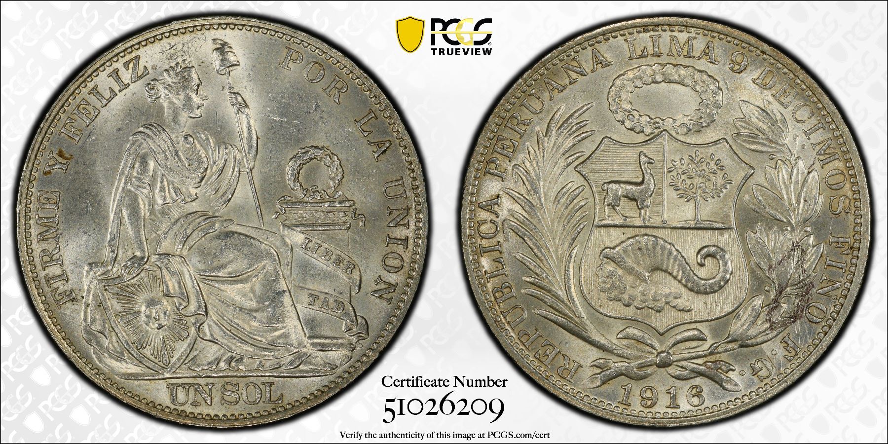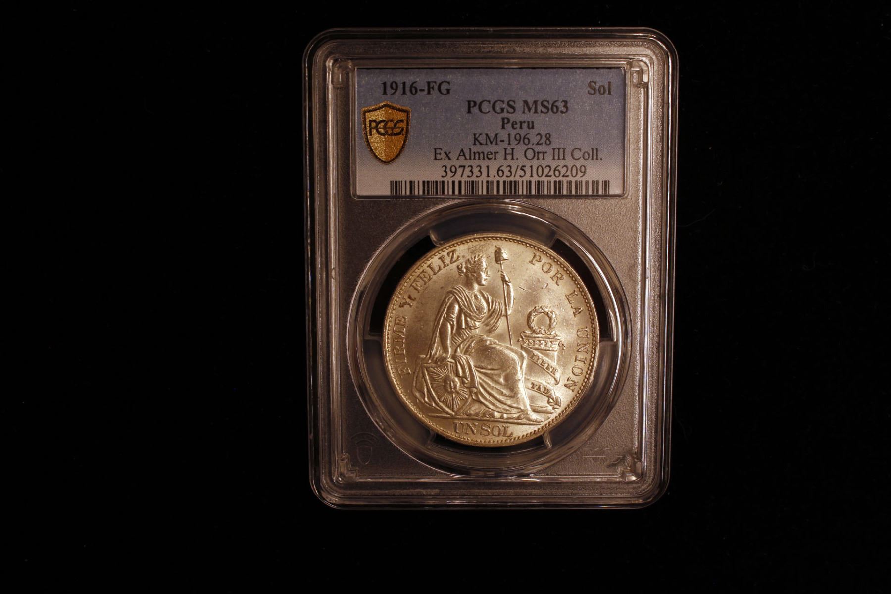 PERU: Republic, AR sol, 1916, KM-196.28, a lovely example, PCGS graded MS63, ex Almer H. Orr III Collection.