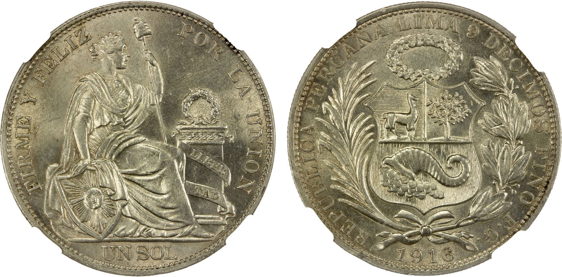 PERU: Republic, AR sol, Lima, 1916, KM-196.28, mintmaster initials FG, a pleasing mint state example, NGC graded MS62.