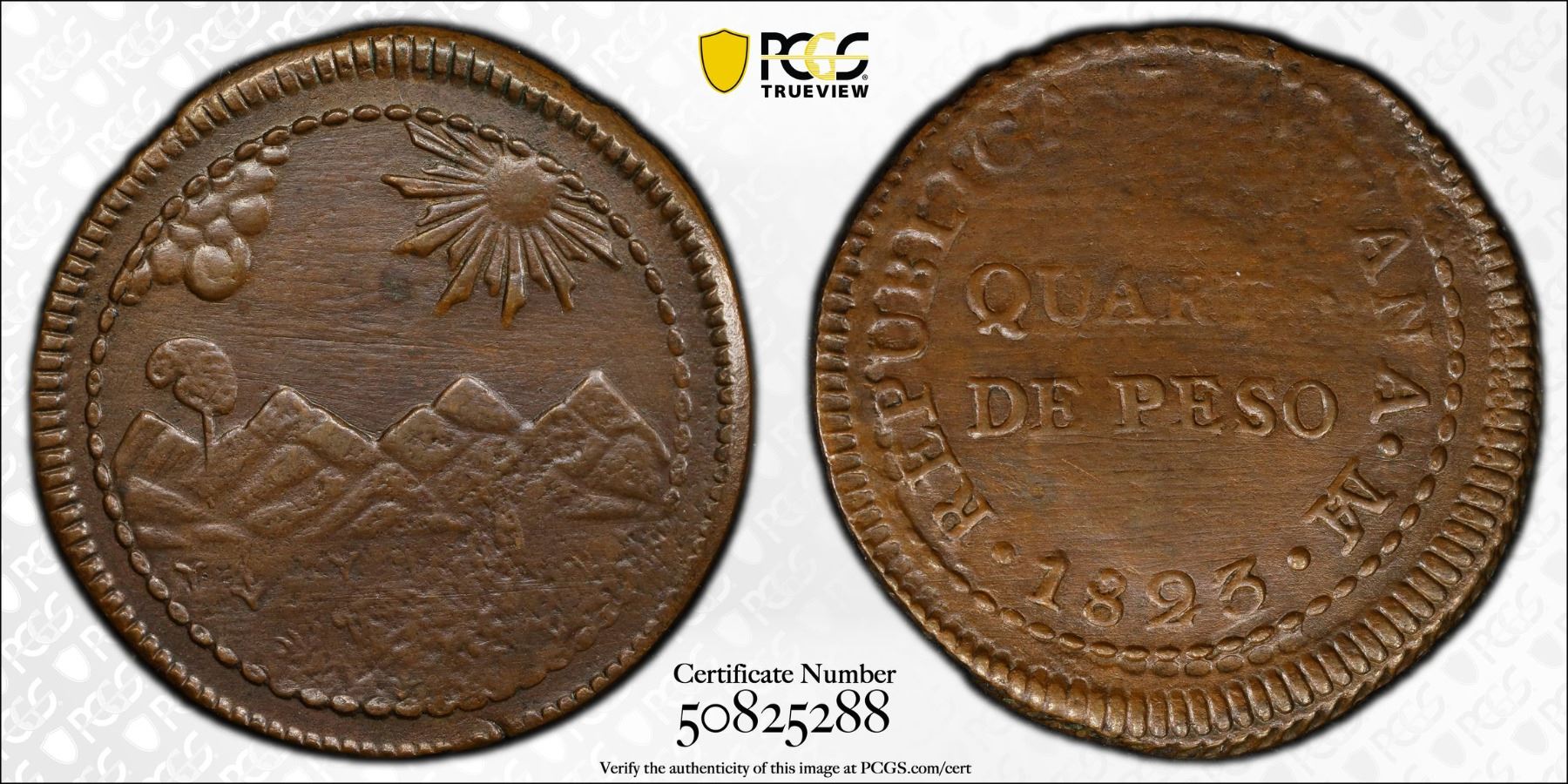 PERU: Rupublic, 1/4 peso, Lima, 1823-L, PCGS graded About Unc details