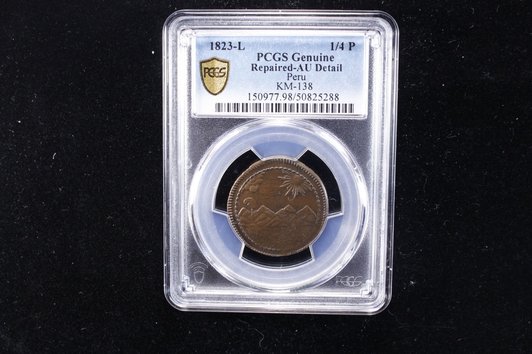 PERU: Rupublic, 1/4 peso, Lima, 1823-L, KM-138, provisional coinage, off center strike on reverse, repaired, PCGS graded About Unc details.