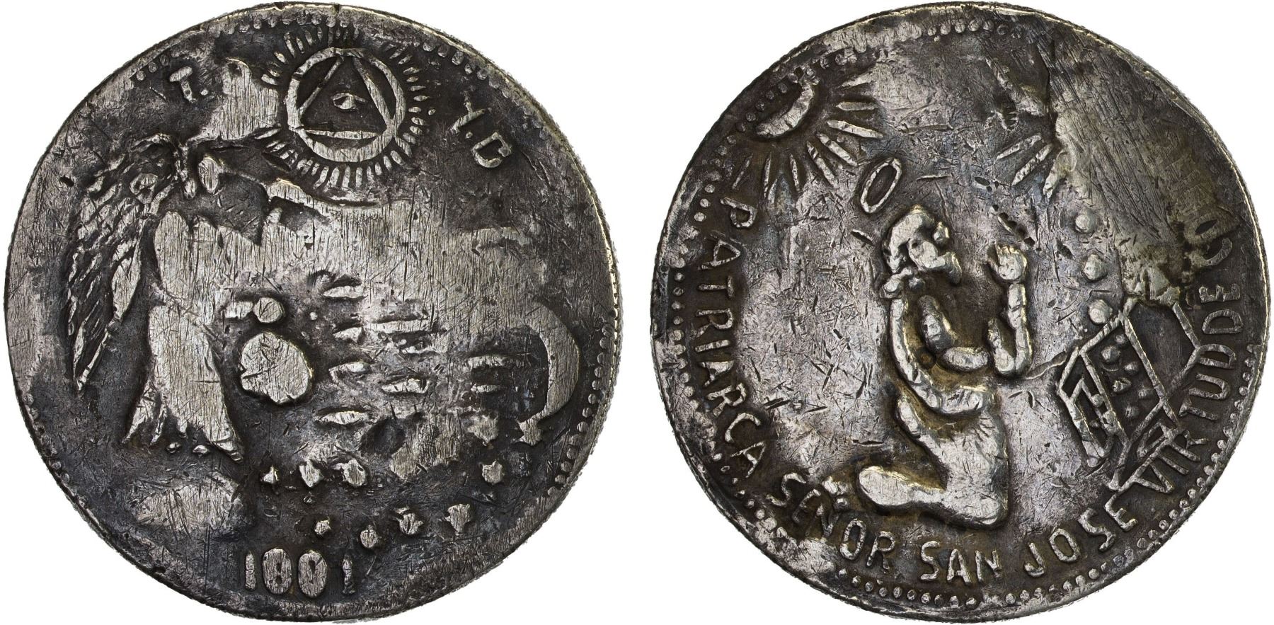 PHILIPPINES: AR 'anting-anting' medal (33.54g), Honeycutt-1420, YL-15, 41mm, angel blowing trumpet over crescent, stars, and waves, All-Seeing Eye above, fictitious date 1001 below // St. Joseph kneeling right in prayer, radiant crescent and sun above, with coins falling from sun into chest below, PATRIARCA SENOR SAN JOSE VIRTUD DE COMMERCIO, scratches, polished, F-VF. Anting-anting are religious talismans used as tangible representations of Filipino beliefs. They are crudely made and were supposedly produced in Laguna Province. One source gives their dates of manufacture as approximately 1950 to the mid-80's. The dates sometimes represented on the medals are fictitious. There are many different obverse and reverse types, and were paired to create many combinations, much like the Javanese gobogs.