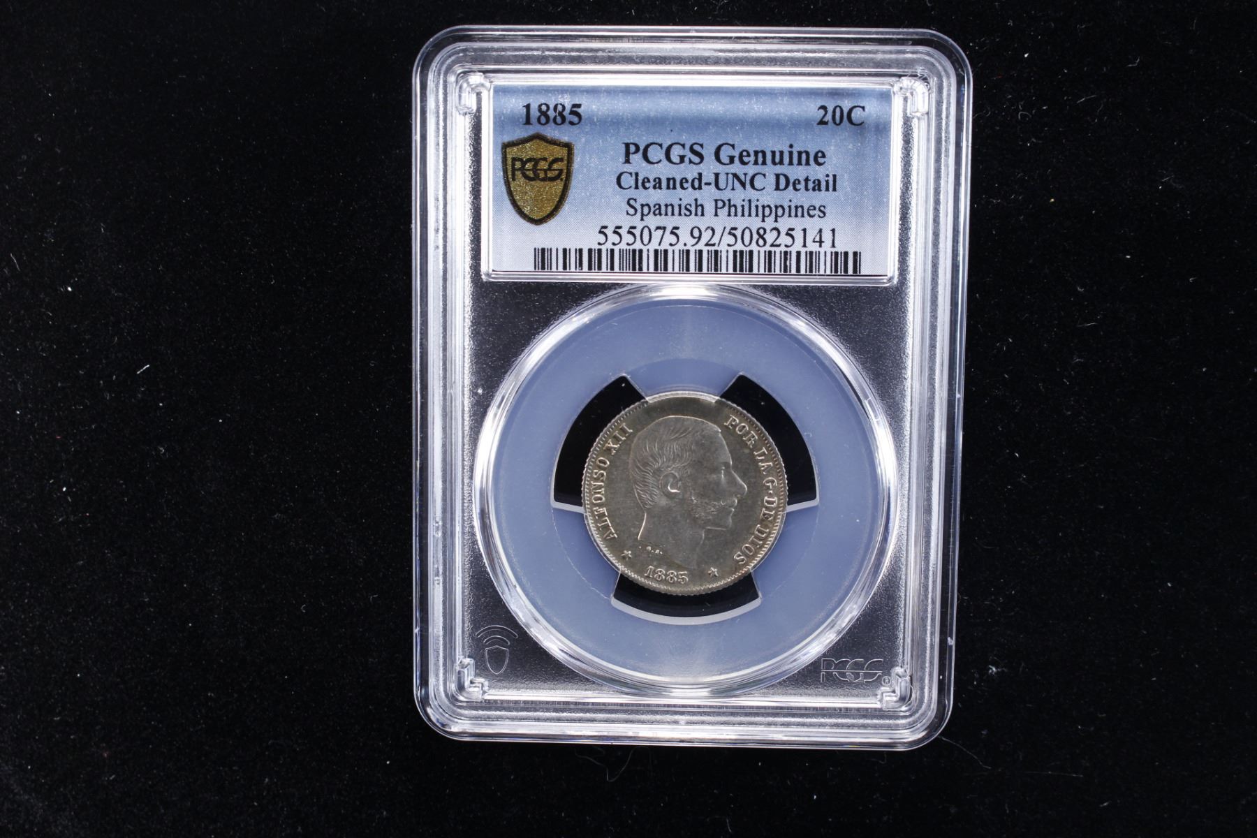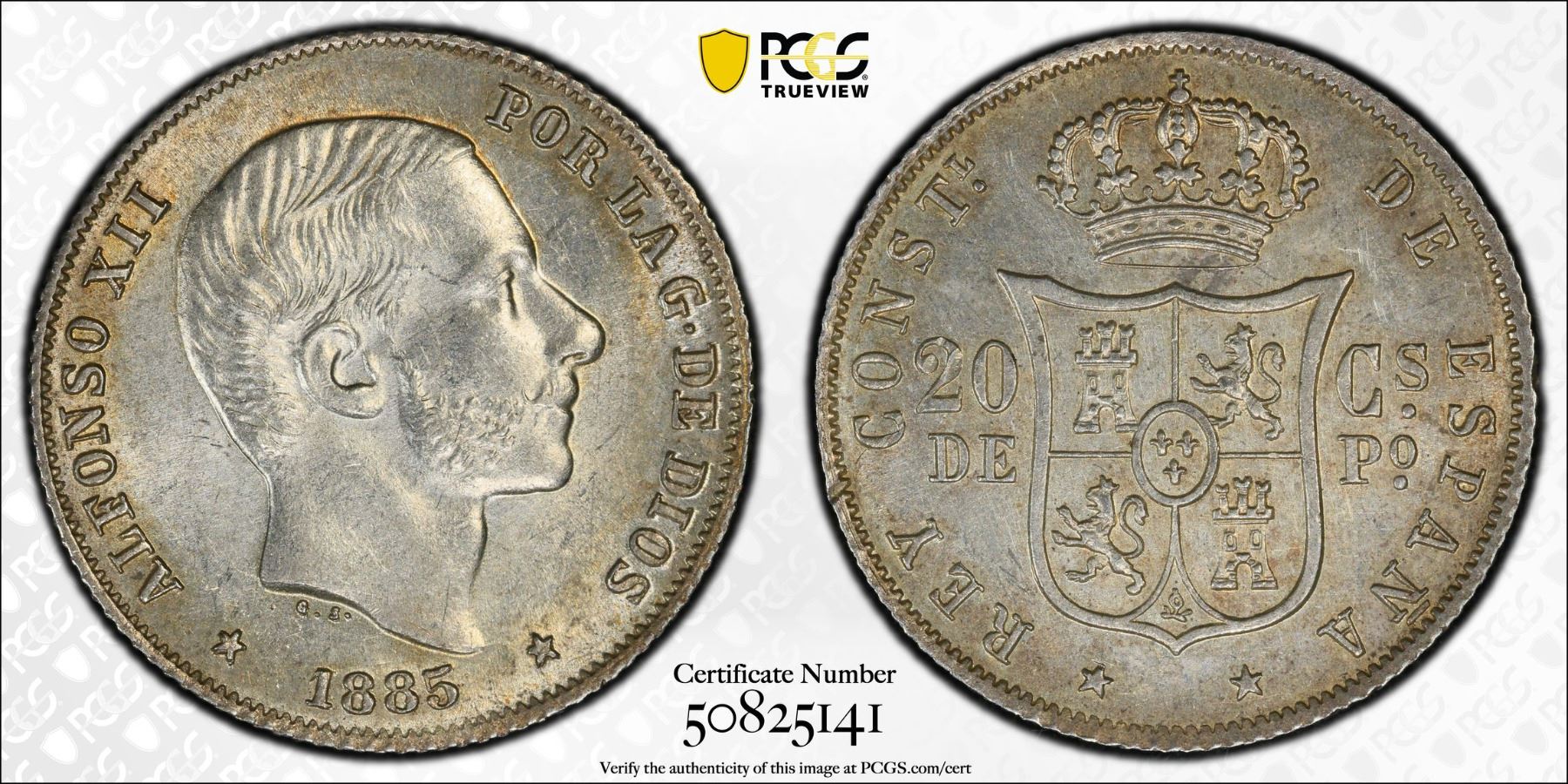 PHILIPPINES: Alfonso XII, 1874-1885, AR 20 centimos, 1885, KM-149, Minted at the Real Casa de la Moneda, Madrid, Spain, and struck with frozen date 1885 from 1885 to 1898, cleaned, a well struck example, PCGS graded Unc details.