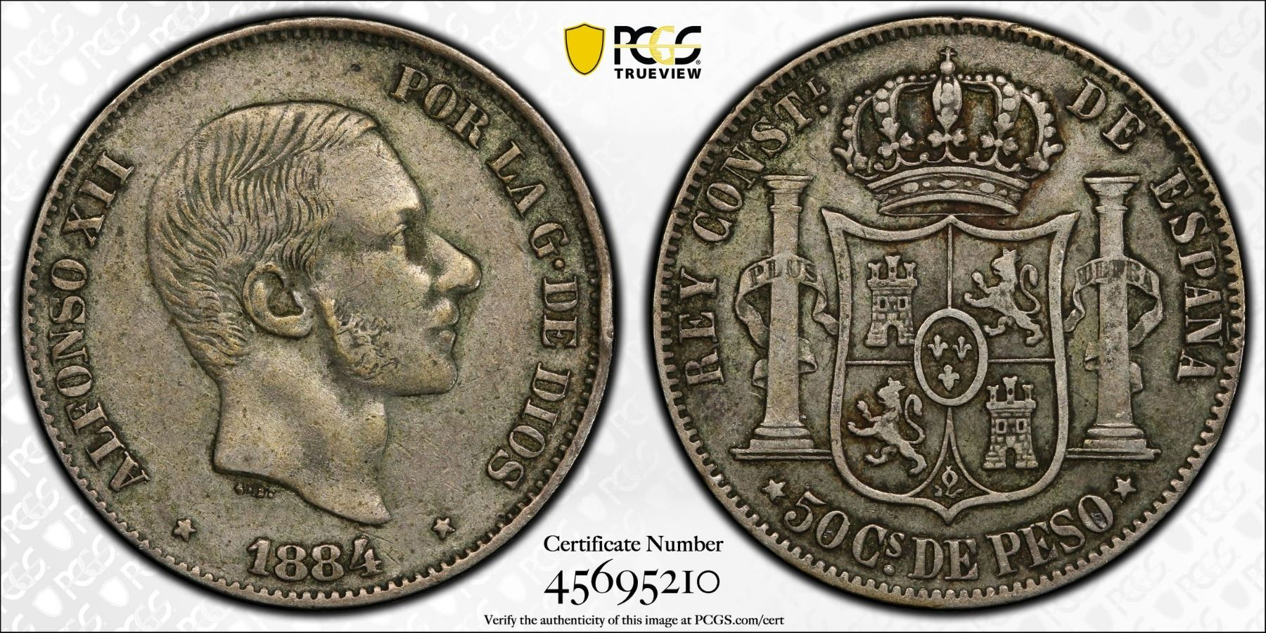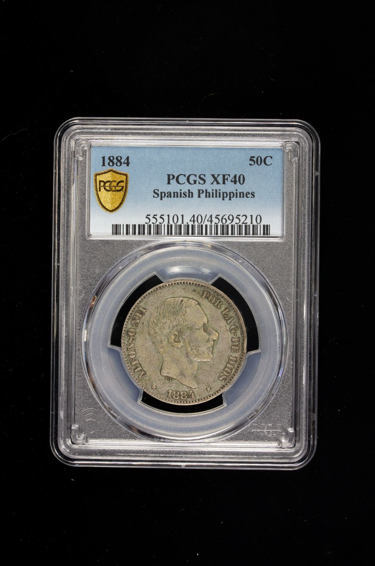 PHILIPPINES: Alfonso XII, 1874-1885, AR 50 centavos, 1884, KM-150, key date to the series! PCGS graded EF40.