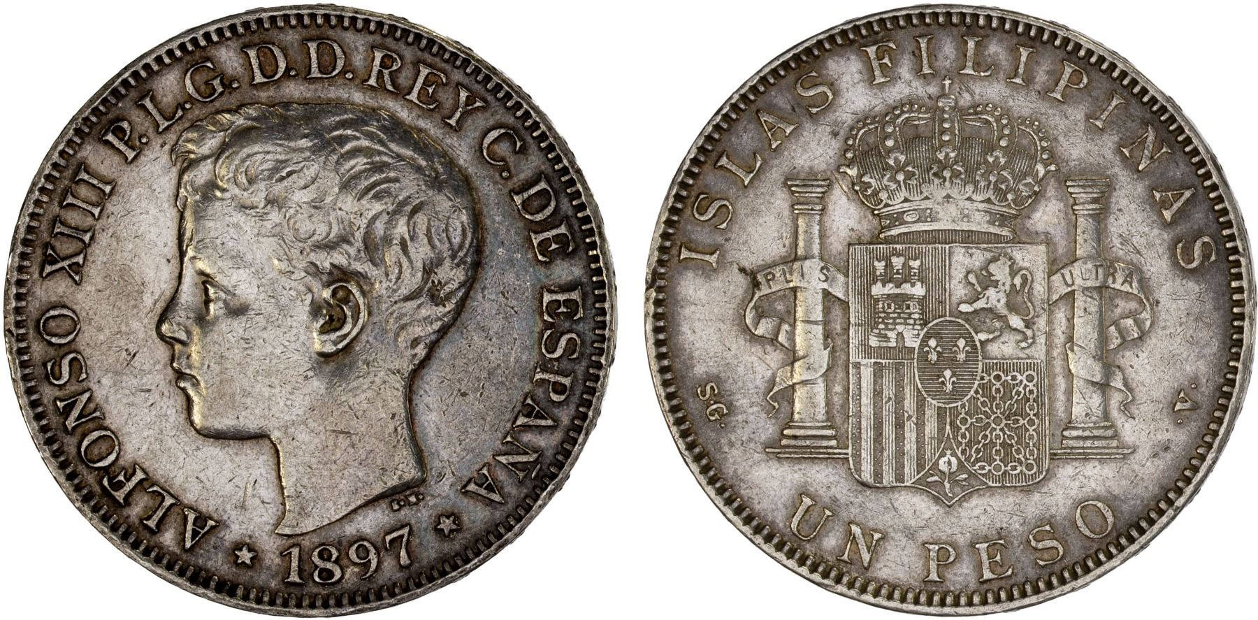 PHILIPPINES: Alfonso XIII, 1886-1931, AR peso, 1897, KM-154, initials SGV, lightly toned, traces of luster, VF-XF.