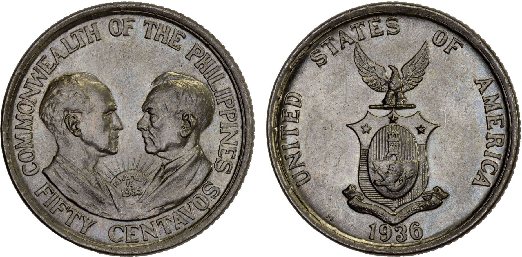 PHILIPPINES: Commonwealth, AR 50 centavos, 1936, KM-176, Establishment of the Commonwealth, Murphy and Quezon, a few hairlines, Unc.