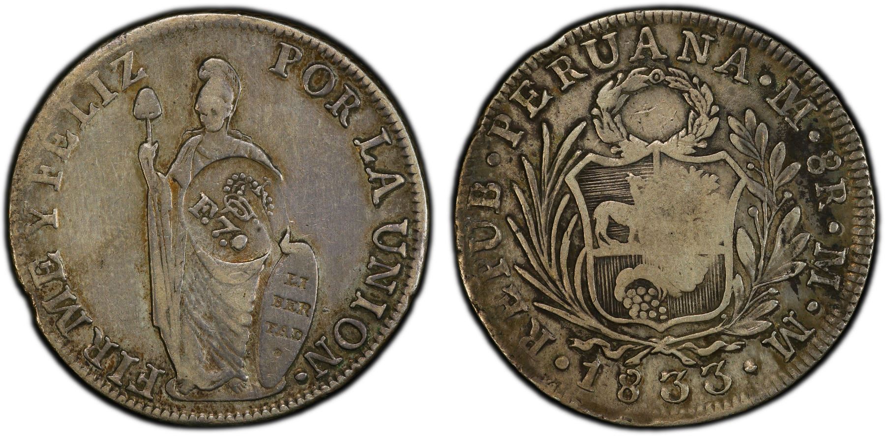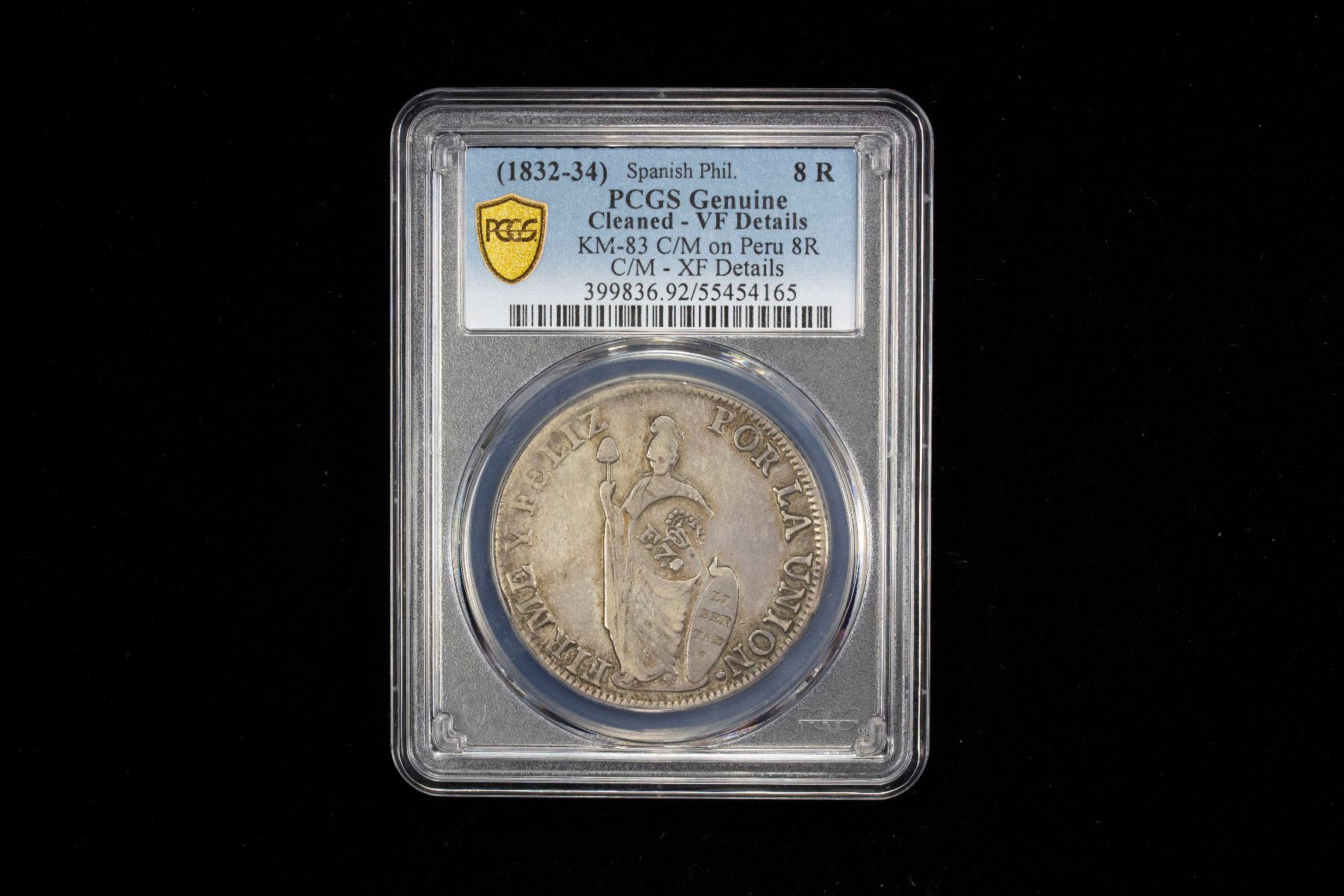 PHILIPPINES: Fernando VII, 1808-1833, AR 8 reales, ND (1832-34), KM-83, crowned F.7.o countermark on Peru 1833 Lima Mint 8 reales, assayer MM, cleaned, PCGS graded XF details countermark on VF details host. The type V countermark was authorized October 2, 1832, and commenced October 5, 1832. The countermarking of this type officially ended December 20, 1834.