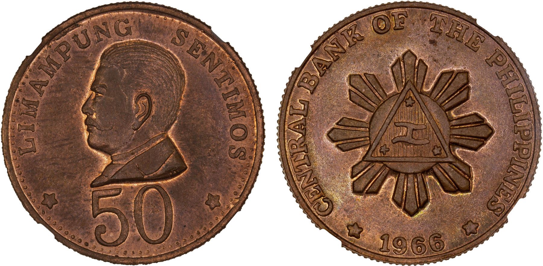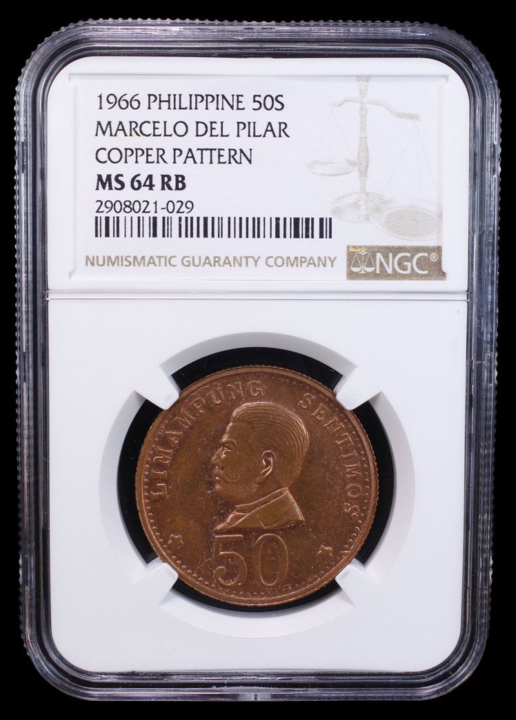 PHILIPPINES: Republic, AE 50 sentimos, 1966, copper pattern, stylized radiant triangle shield with "CENTRAL BANK OF THE PHILIPPINES - 1966" around // bust left of Marcelo H. Del Pilar with "50" below and LIMAMPUNG SENTIMOS around, reeded edge, NGC graded MS64 RB. This series of private or semi-official patterns were produced between 1966 and 1970. These unusual items have long been sought after by Philippines collectors.