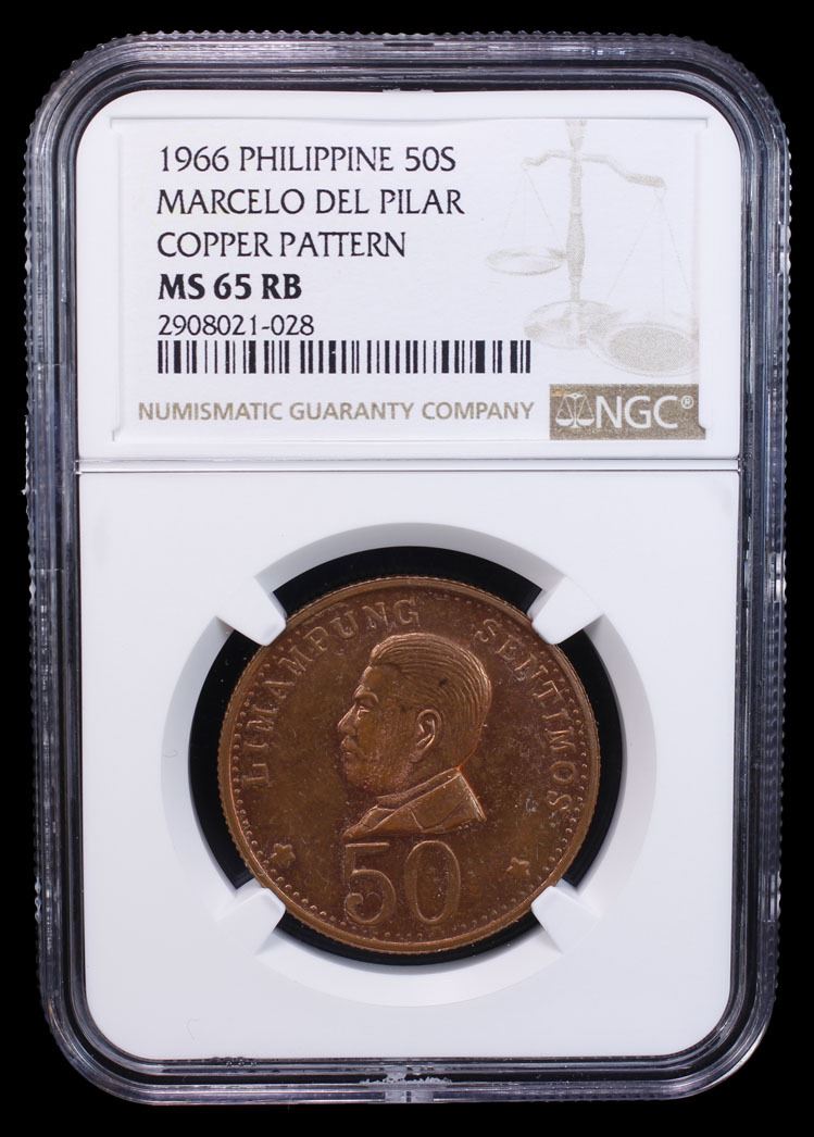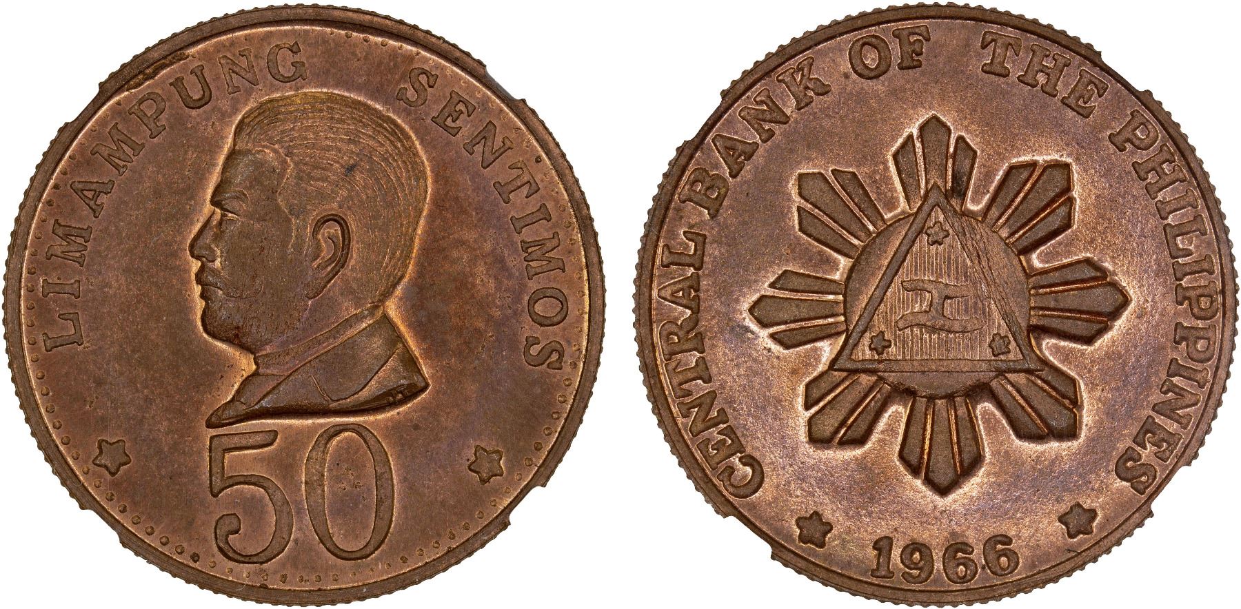 PHILIPPINES: Republic, AE 50 sentimos, 1966, copper pattern, stylized radiant triangle shield with "CENTRAL BANK OF THE PHILIPPINES - 1966" around // bust left of Marcelo H. Del Pilar with "50" below and LIMAMPUNG SENTIMOS around, reeded edge, NGC graded MS65 RB. This series of private or semi-official patterns were produced between 1966 and 1970. These unusual items have long been sought after by Philippines collectors.