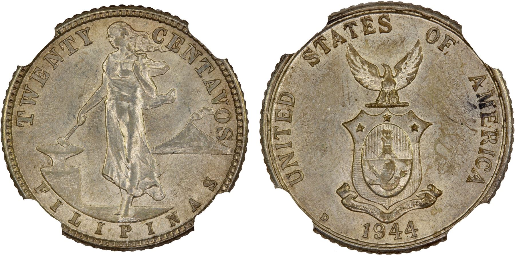 PHILIPPINES: U. S. Commonwealth, AR 20 centavos, 1944-D/S, NGC MS63