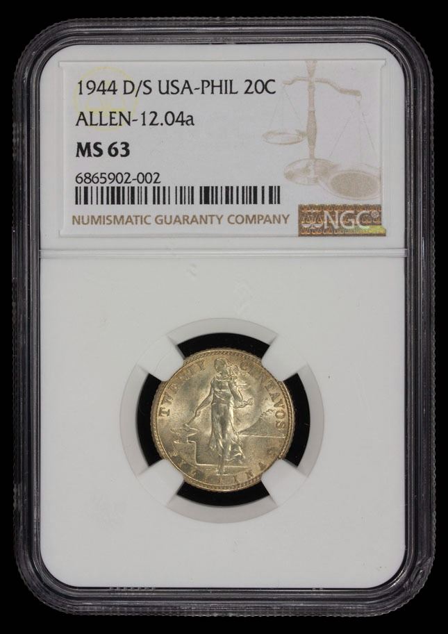 PHILIPPINES: U. S. Commonwealth, AR 20 centavos, 1944-D/S, KM-182, Allen-12.04a, a lovely example, NGC graded MS63.