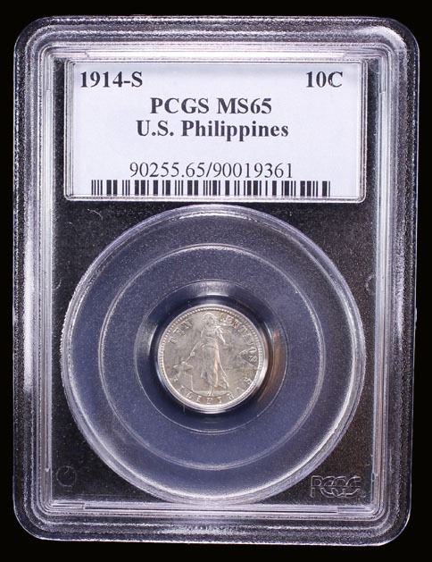 PHILIPPINES: U.S. Territory, AR 10 centavos, 1914-S, KM-169, Allen-8.10b, variety with long crossbar on the 4, very lustrous, PCGS graded MS65, ex Heritage Auction 1314 Lot 8104, ex The 1914 Collection. Tied for finest graded by PCGS.