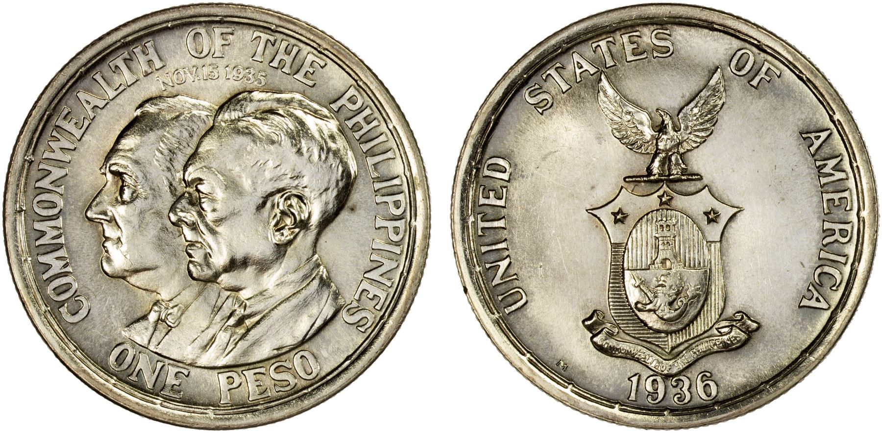 PHILIPPINES: U.S. Territory, AR peso, 1936-M, KM-177, Establishment of the Commonwealth-Roosevelt and Quezon, a few reverse hairlines, mintage of only 10,000 pieces, Unc, ex Almer H. Orr III Collection.