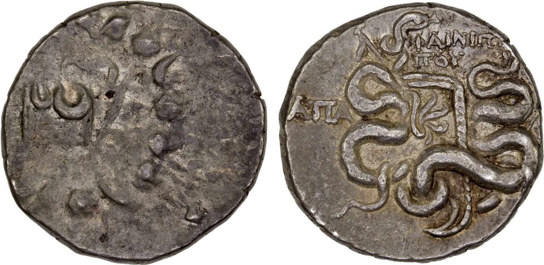 PHRYGIA: Apameia, AR cistophoric tetradrachm (12.78g), c. 100-50 BC, cf. SNG Copenhagen 150ff (for type), magistrate Phainippos (apparently unrecorded in silver), cista mystica within ivy wreath // two serpents entwined around bow and bowcase decorated with aphlaston, AΠA to left, two flutes to right, magistrate name above, VF