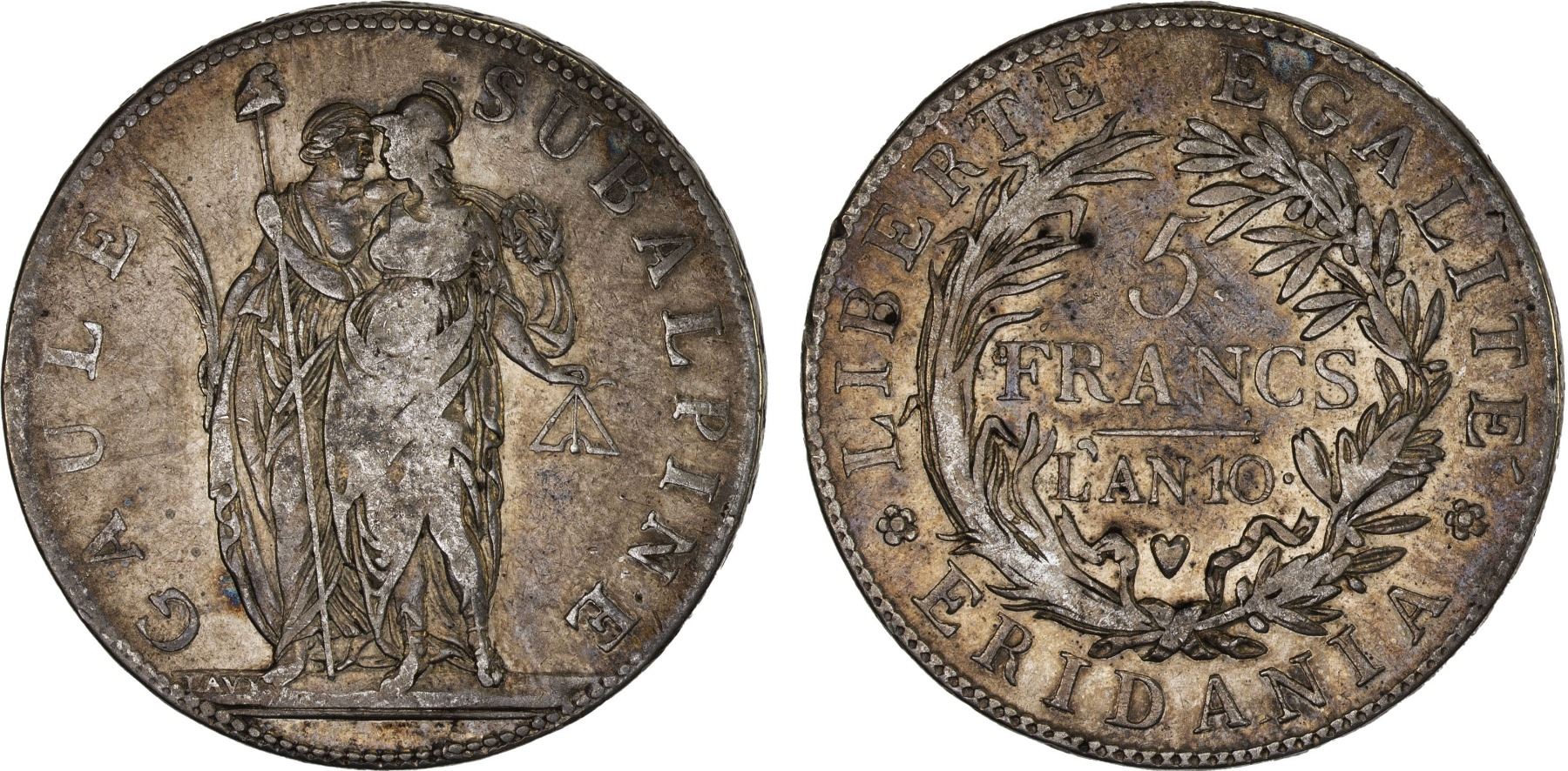 PIEDMONT REPUBLIC: Subalpine Republic, AR 5 francs, AN10 (1801-2), Cr-4, some central weakness, barely visible reverse adjustment marks, a few tiny reverse spots, still attractive, two-year type, VF.